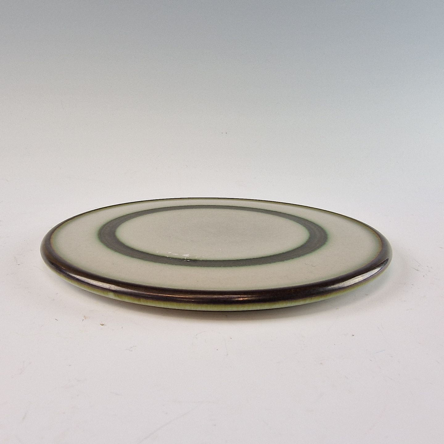 Stellet Tema er af stentøj, glaseret med lys grå og dekoreret med kanter af grønne og brune farver