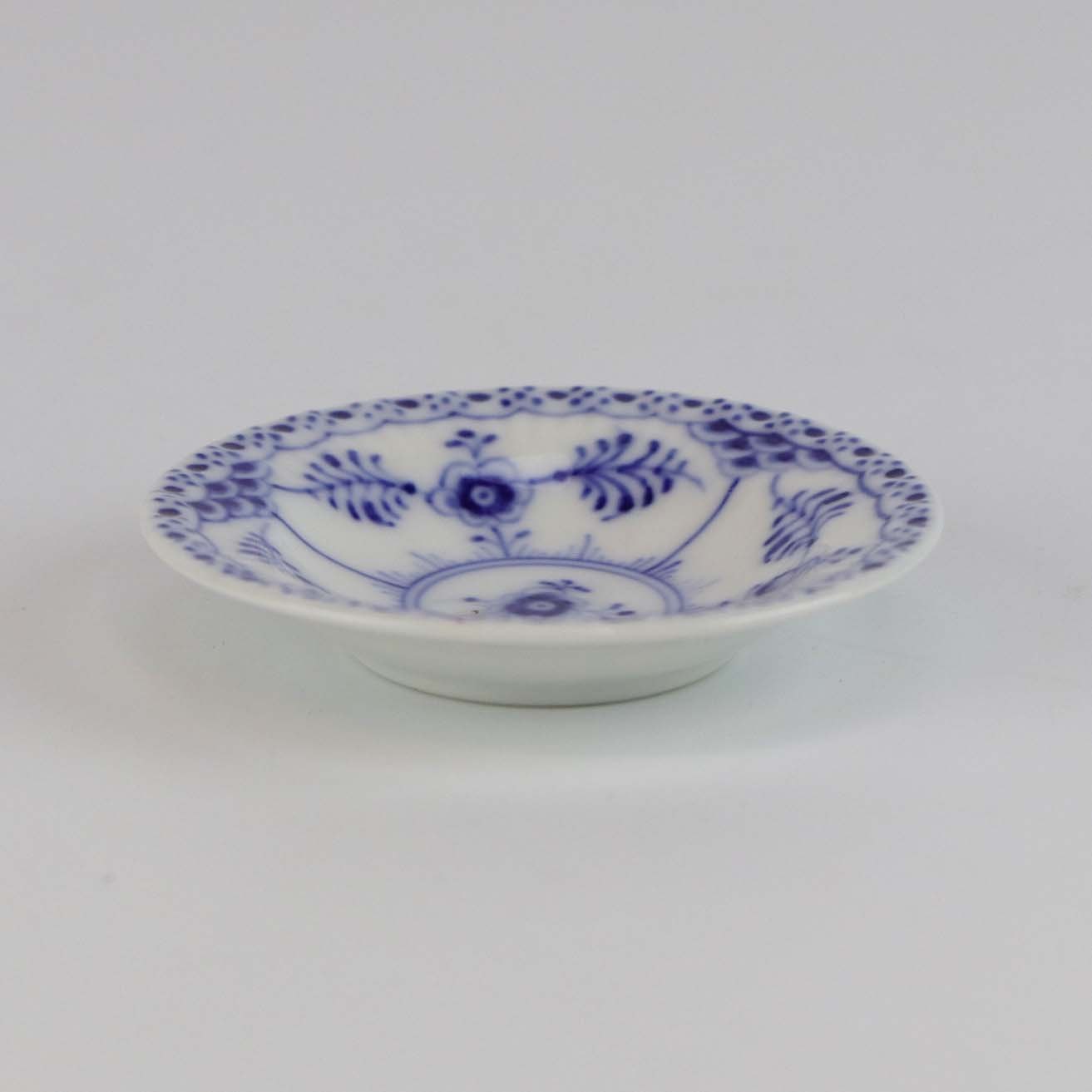 Musselmalet halvblonde er riflet hvidt porcelæn med dekoration af blå ranker og en kant med blonder