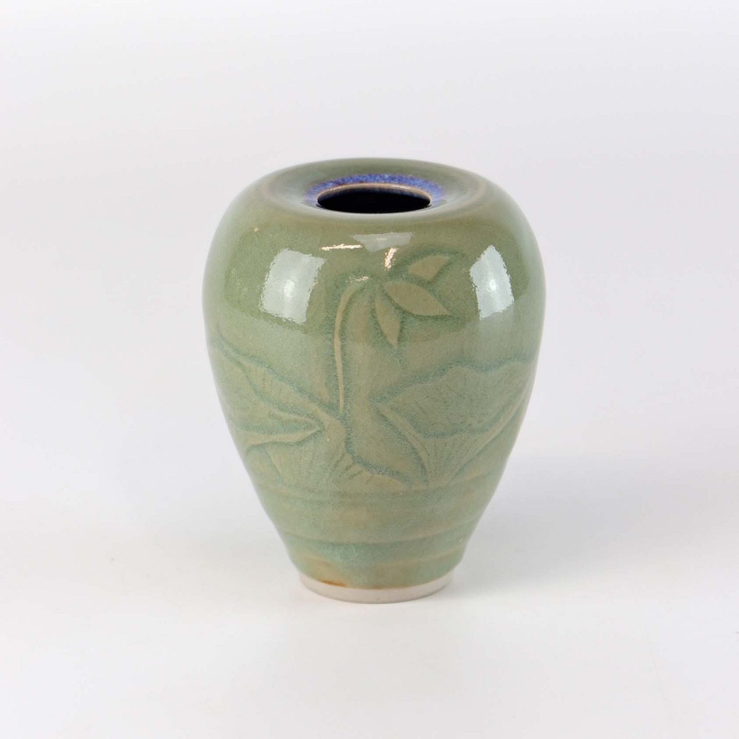 Miniature vase i grøn glaseret stentøj med blå topkant med motiv af blomst og planter