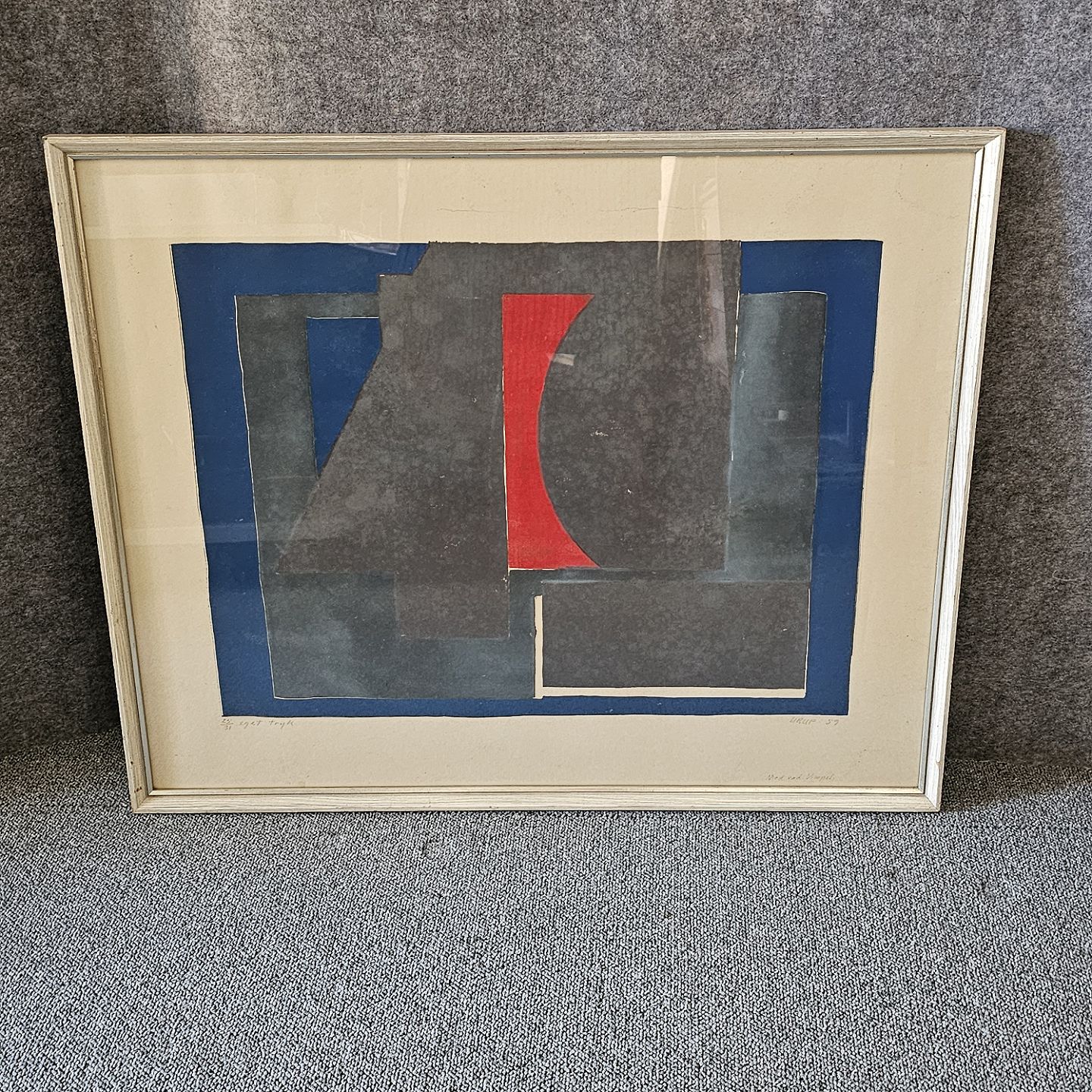 Indrammet Abstrakt litorgrafi i aluminiumramme med titlen Med rød vimpel. Trykket er i med grå, blå og rød farve nr. 25/31, eget tryk.