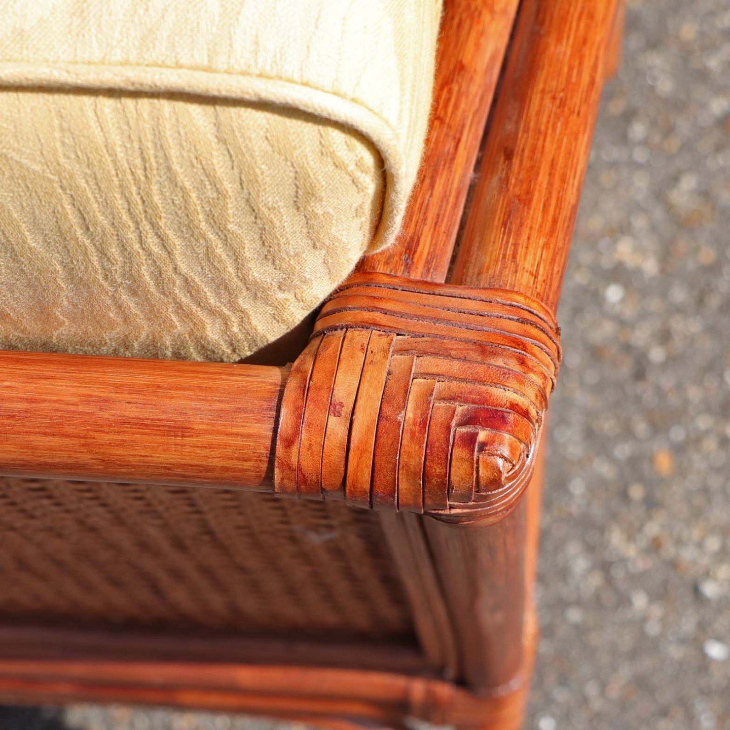 Tre personers sofa i mørk lakeret bambus med flettede sider og skumhynder betrukket med struktureret gult stof. Betrækket er lettere solfalmet.