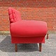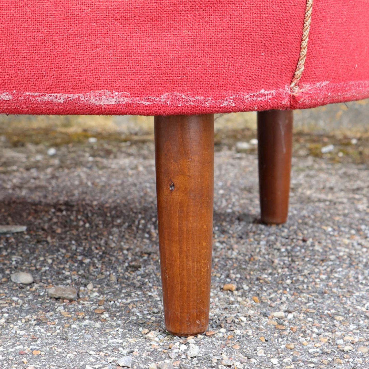 Ældre tre personers boudoir chaiselong sofa betrukket med solfalmet rødt uldstof og mørk lakeret træben.
