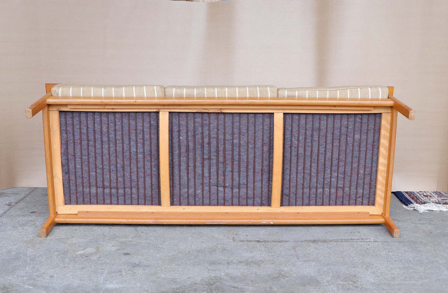 Tre personers sofa med stel i lakeret egetræ. Sofaen er betrykket med stribet meleret uldstof i farven mørk beige