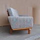 Fire personers sofa med stel i egetræ og hynder med springfjeder, som er betrukket med lyst uldstof. Model GE-236