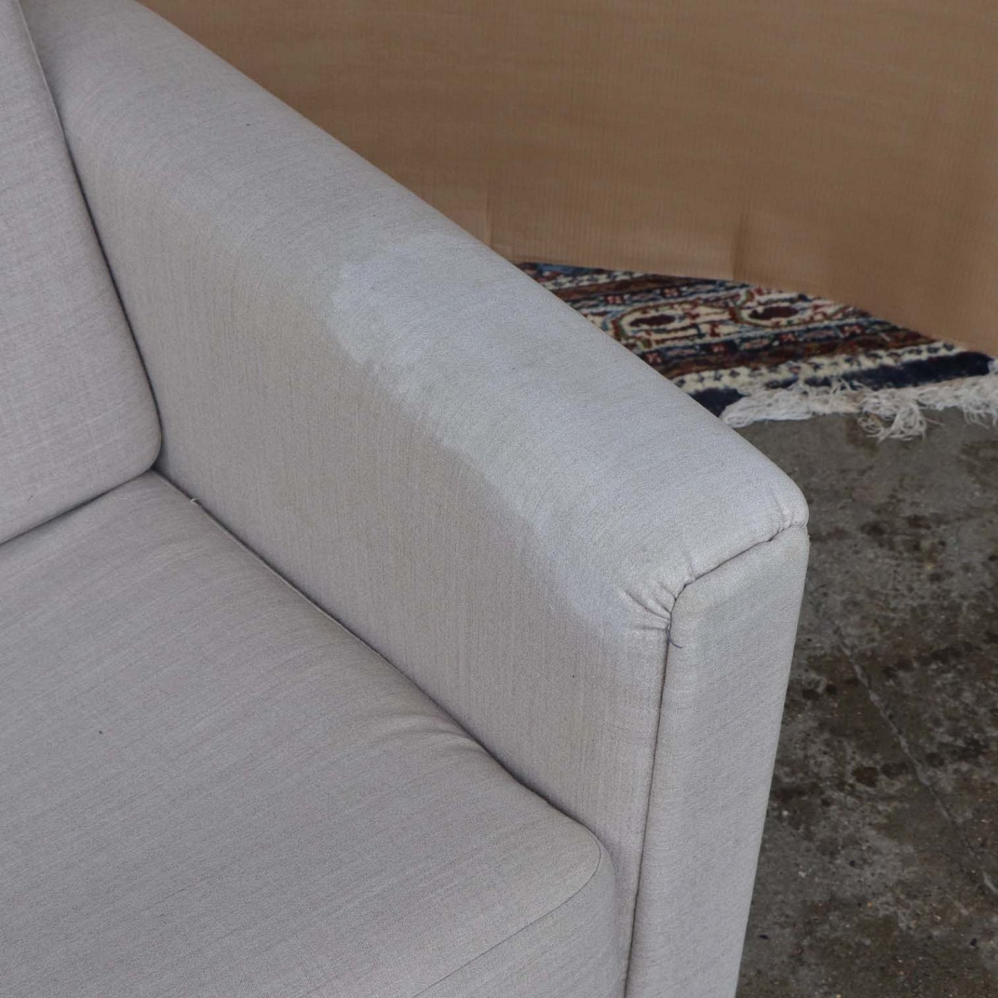 Tre personers sofa med ben i egetræ og hynder med springfjeder, som er betrukket med lyst uldstof. Model GE-300