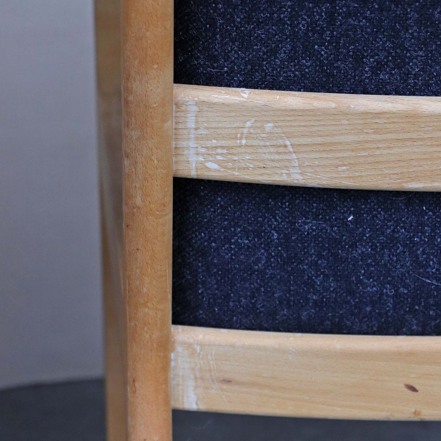 To armstole med stel i lakeret bøgetræ. Stolene har hynder betrukket med sortmeleret uldstof Hallingdal 180 med stropper i læder i pæn stand. Model GE-284