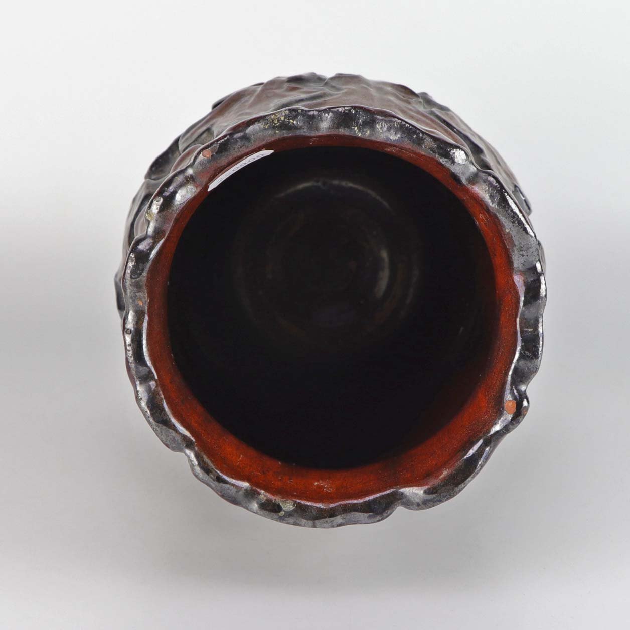 Vase i keramik med mørk glasur og metallisk glans. Den er dekoreret med motiver af egetræsblade.
