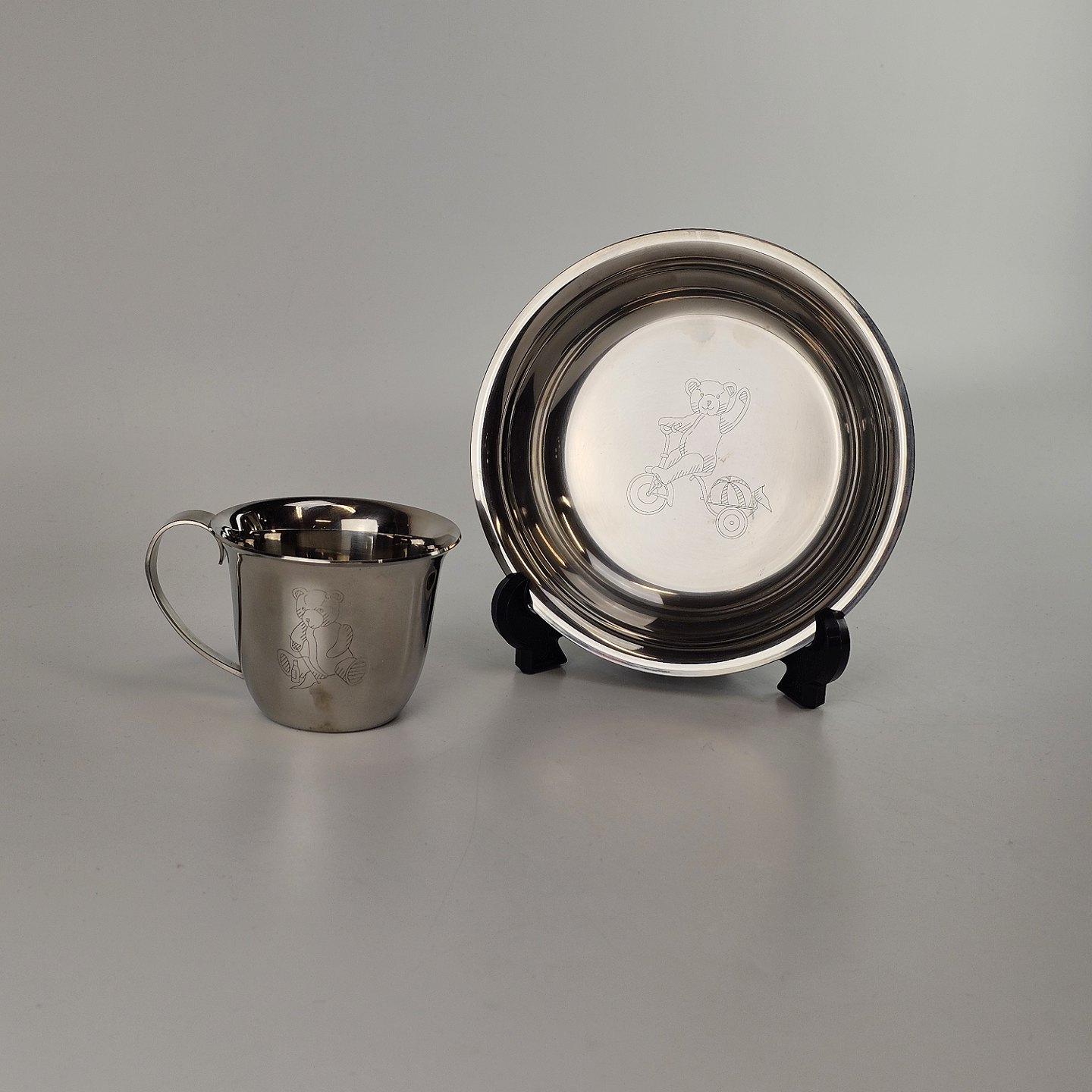 Tallerken og kop i rustfrit stål med motiv af bamser. Julius.