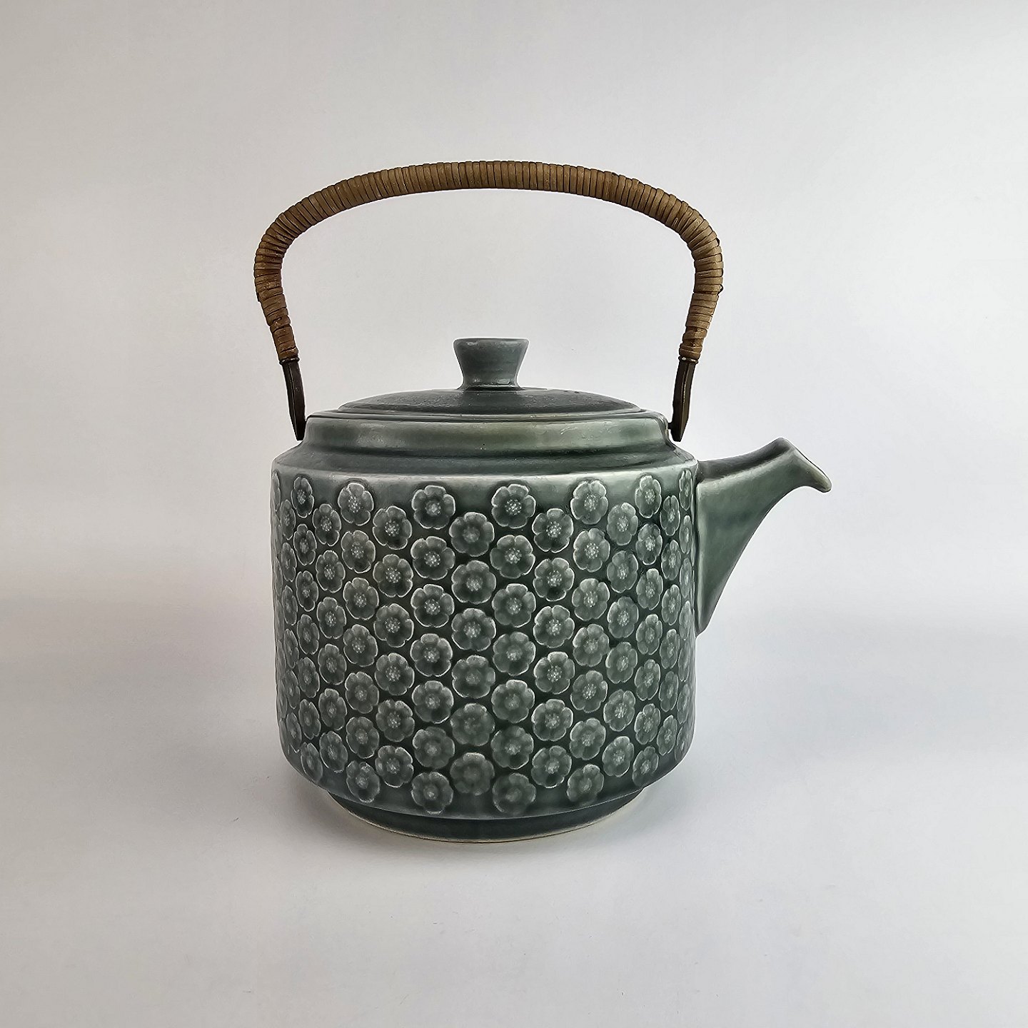 Stel i blågrøn stentøj med blomster motiver og håndtag i messing beklædt med bambusflet.