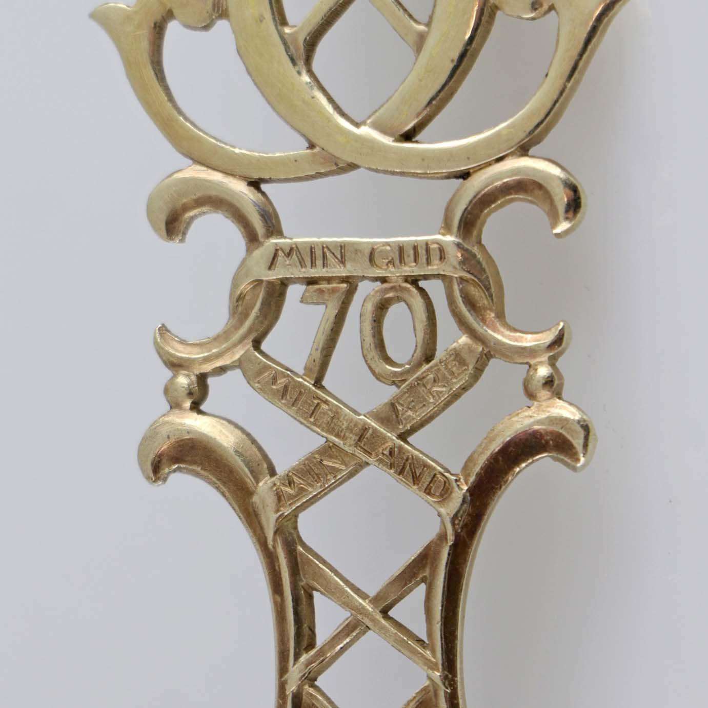 Jubilæumsske i forgyldt tretårnet sølv med indlagt emalje med teksten Min Gud, Mit Land og Min Ære og motiv af kongeligt C monogram. Skeen blev fremstillet i forbindelse med Kong Christian den X's 70 års fødselsdag i 1940.