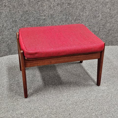 Fodskammel med stel i teaktræ og løs hynde med rødt stof betræk.
