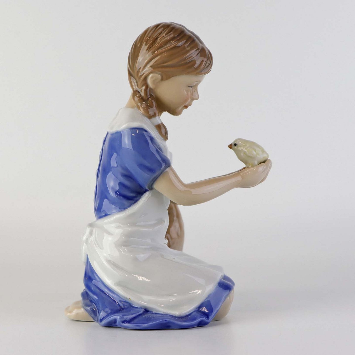 Figur i porcelæn med motiv af ung pige med en gul kylling i hænderne mens hønemor står ved siden af. Nr. 437