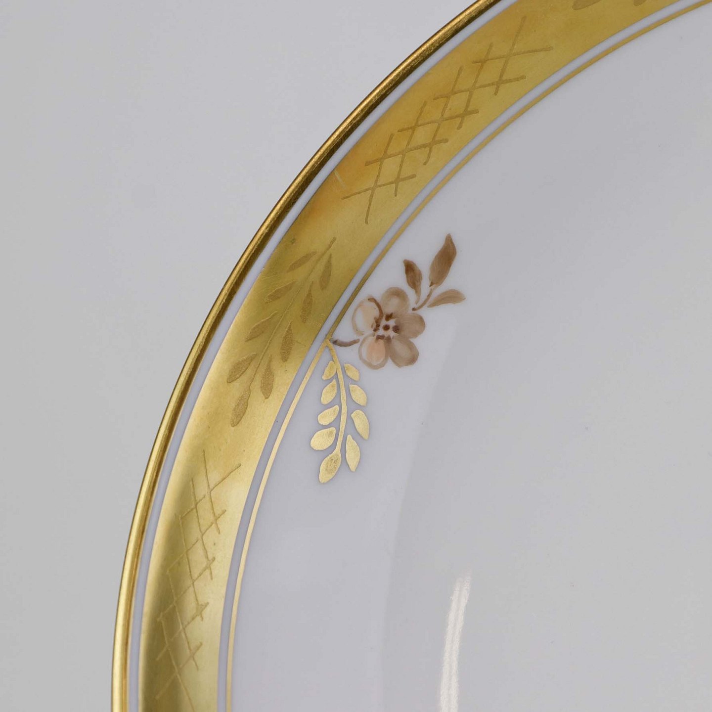 Stel i glat hvidt porcelæn dekoreret med guldkurv og brune blomster samt kantet af med guldbort med bladmotiv.