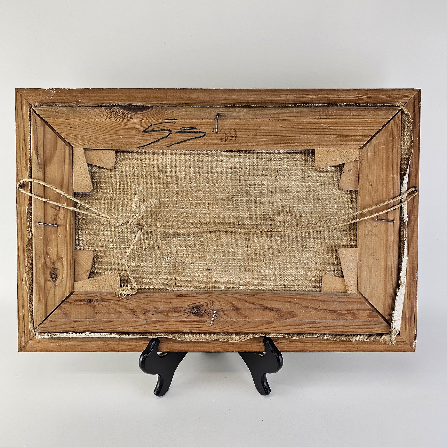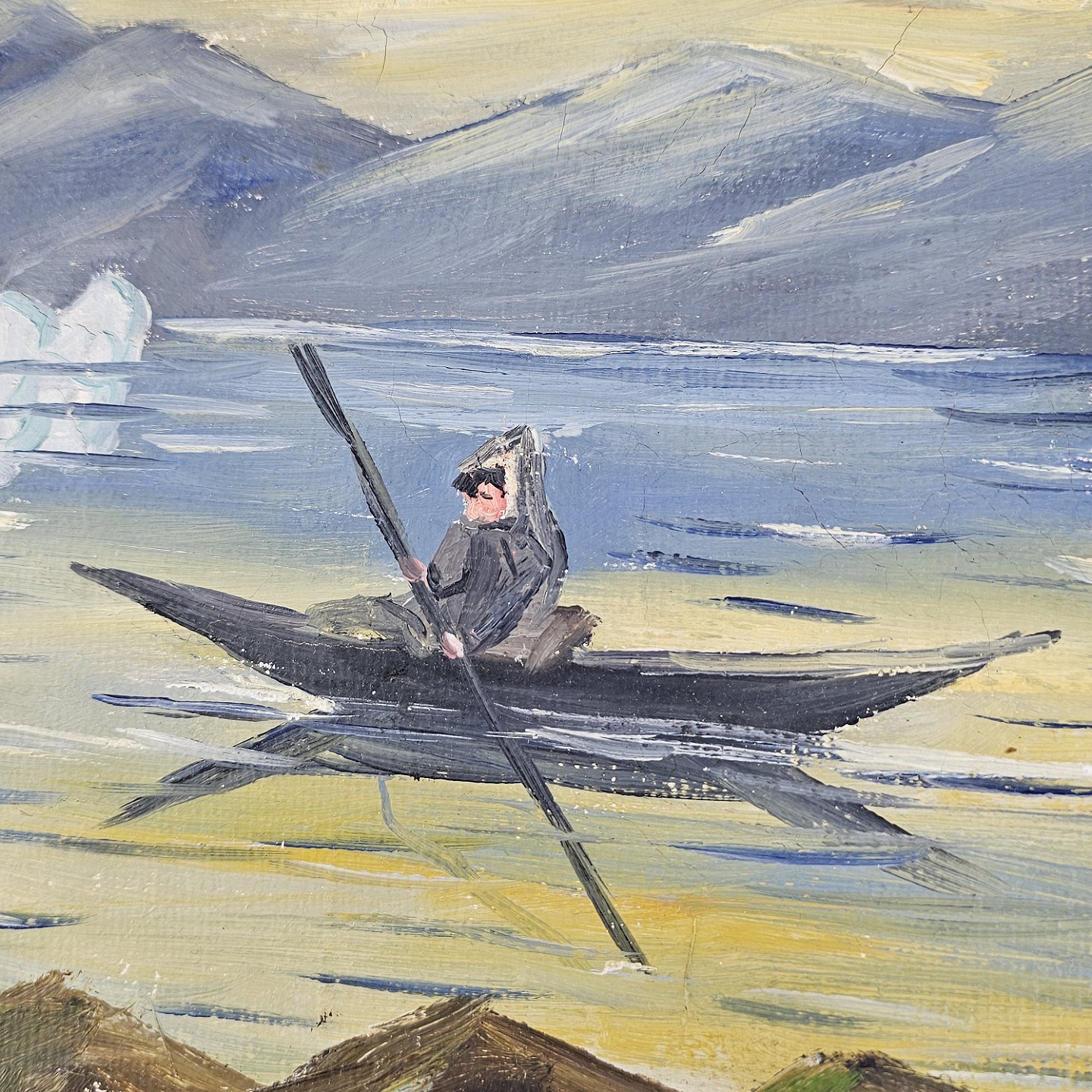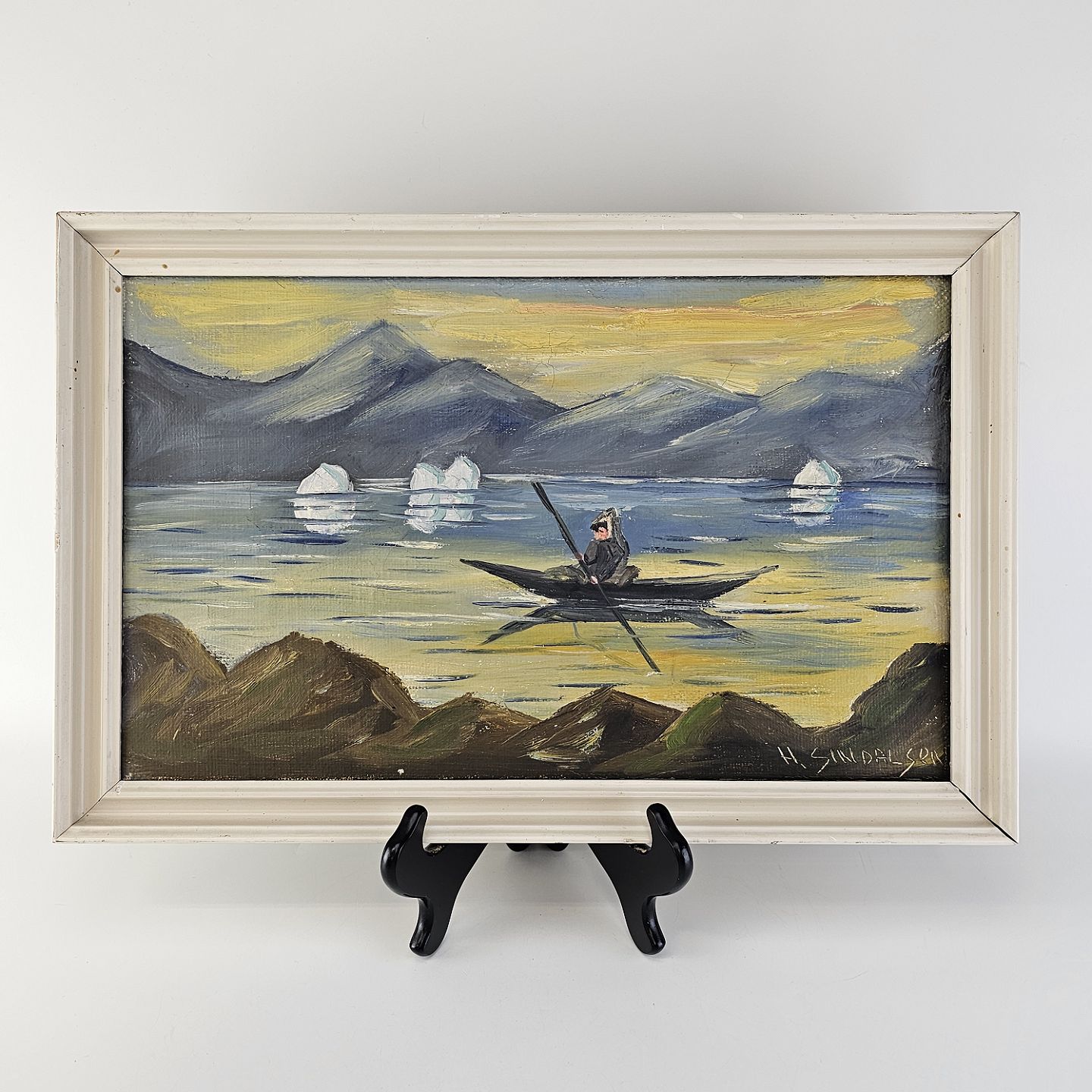 Oliemaleri på lærred i hvidmalet træramme. Havmaleri med et grønlandsk inspireret motiv af en kajaksejler