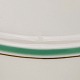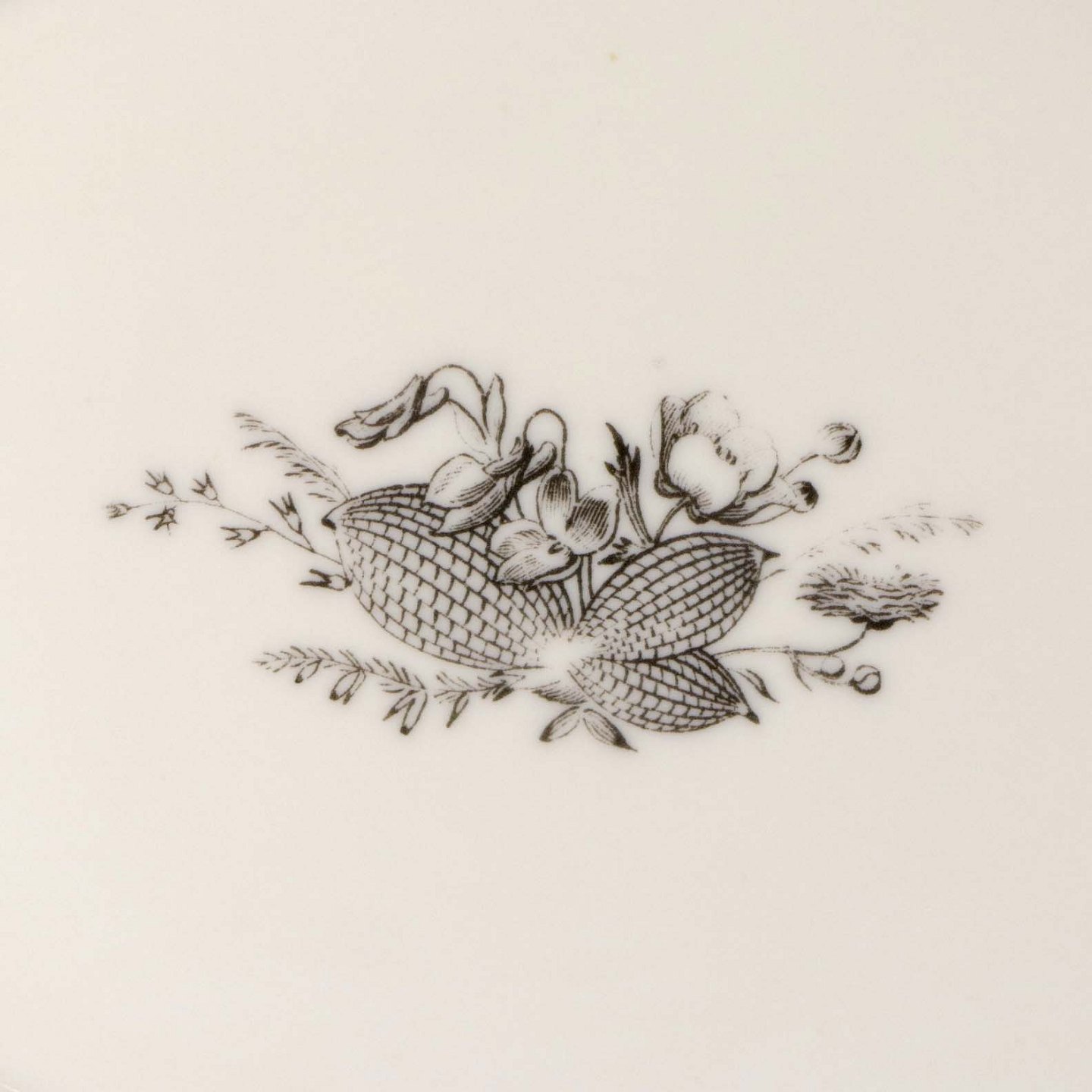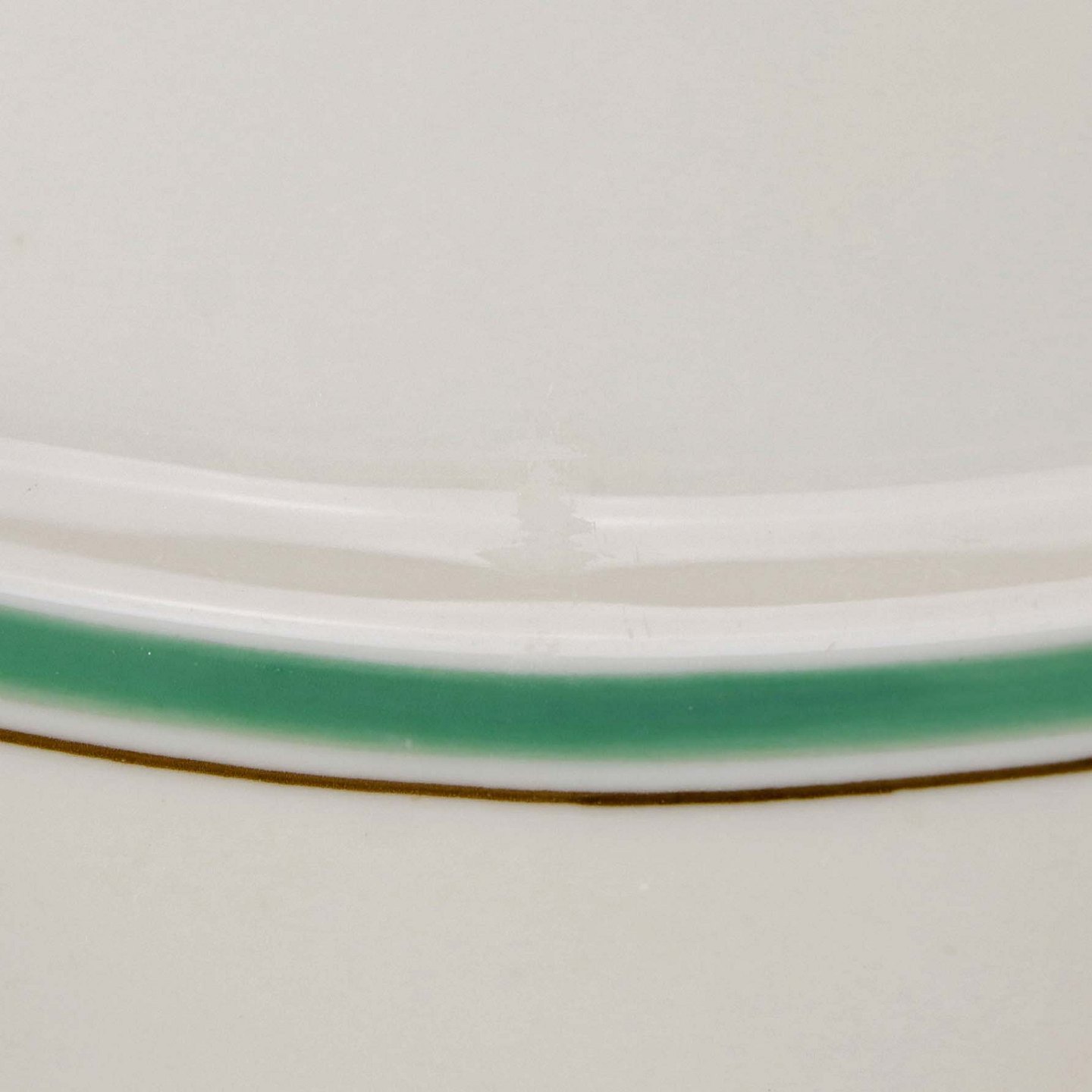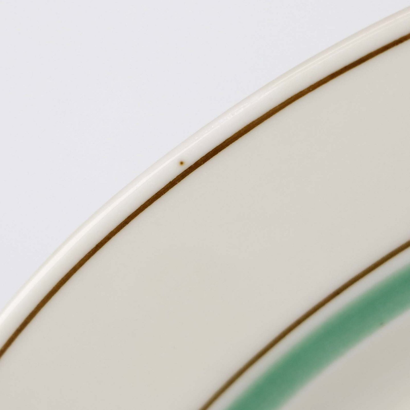Service i glat cremefarvet porcelæn med grøn og sort kantstreg samt dekoration af blomster og grene i sort streg.
