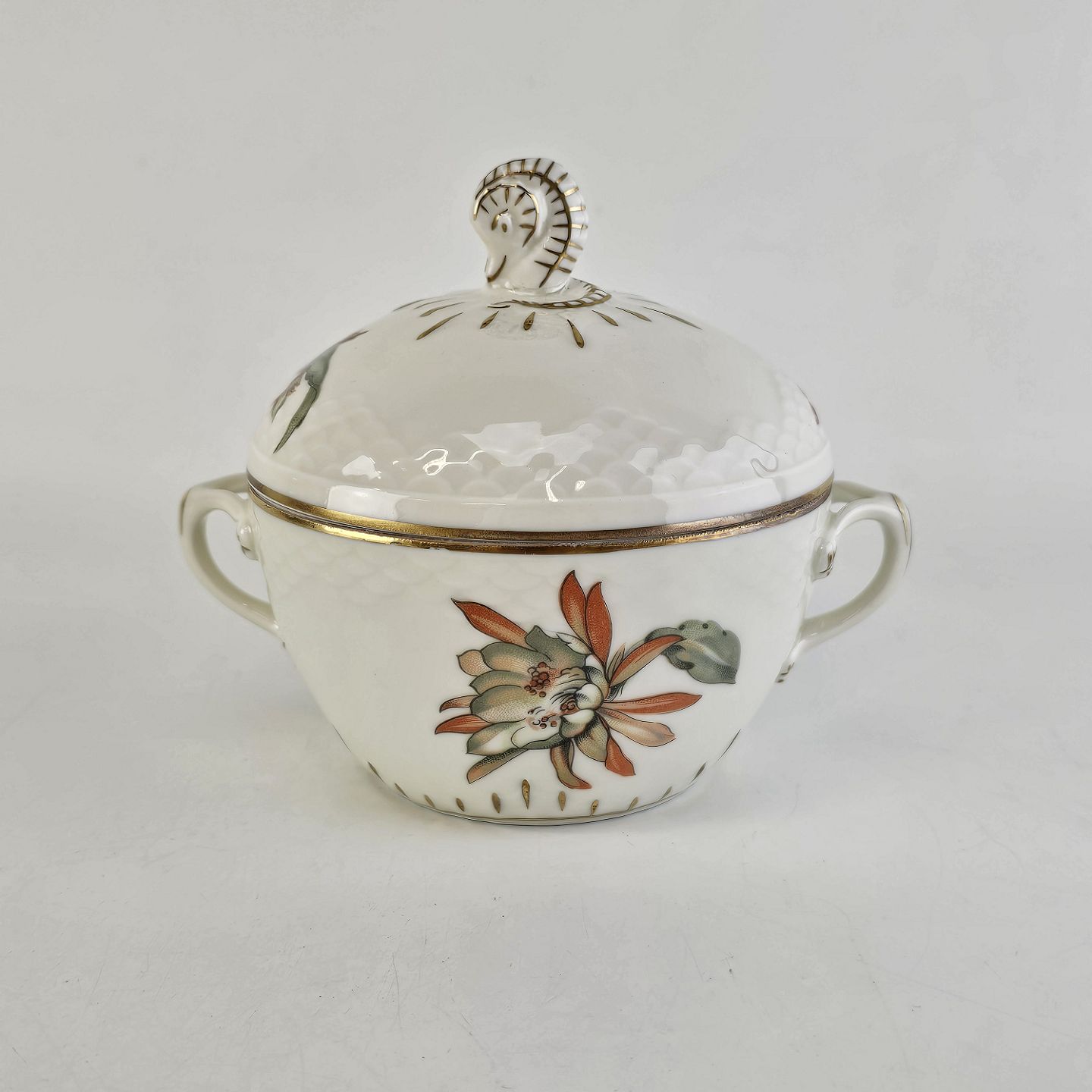 Kaktus er cremefarvet porcelæn i skælform, dekoreret med kaktusblomster og guldkant