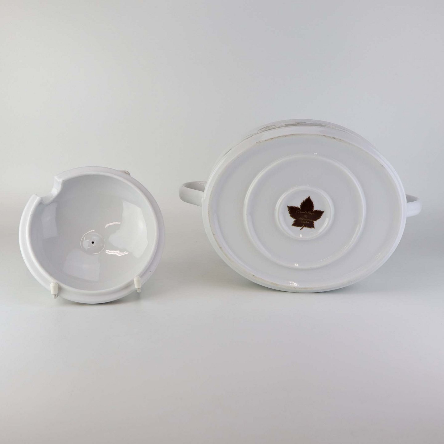 Fremstår med en mindre mørk streg under glasuren samt brugsspor under bunden.