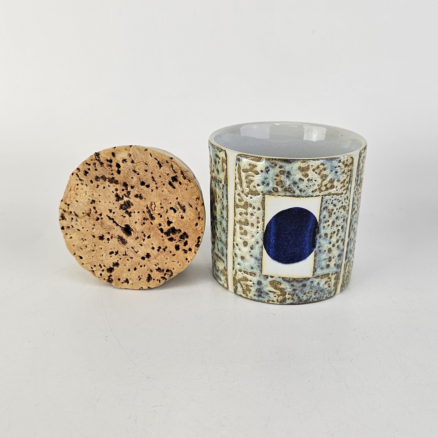 Krukke i fajance med abstrakt mønster i grønne og blå nuancer og korkprop