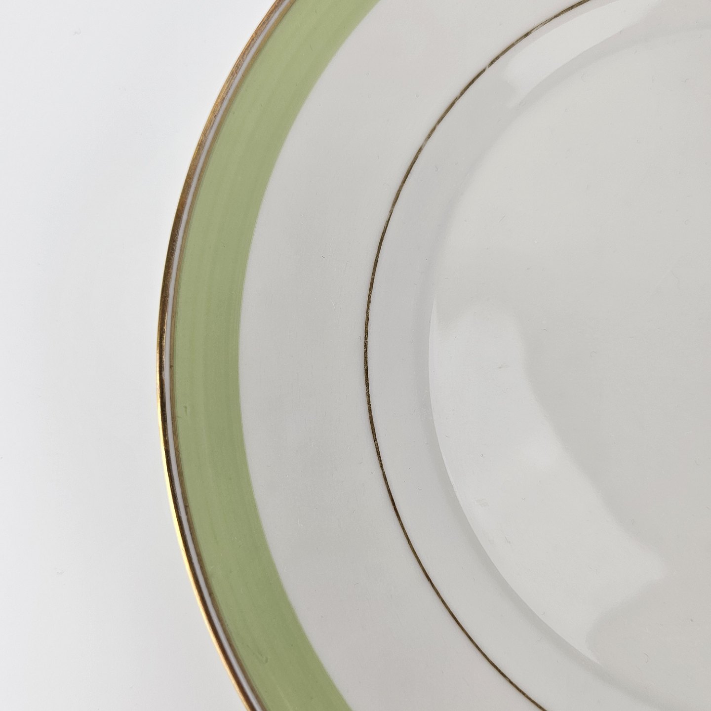 Stellet er fremstillet i glat cremefarvet porcelæn med lysegrøn dekoration og guldkant