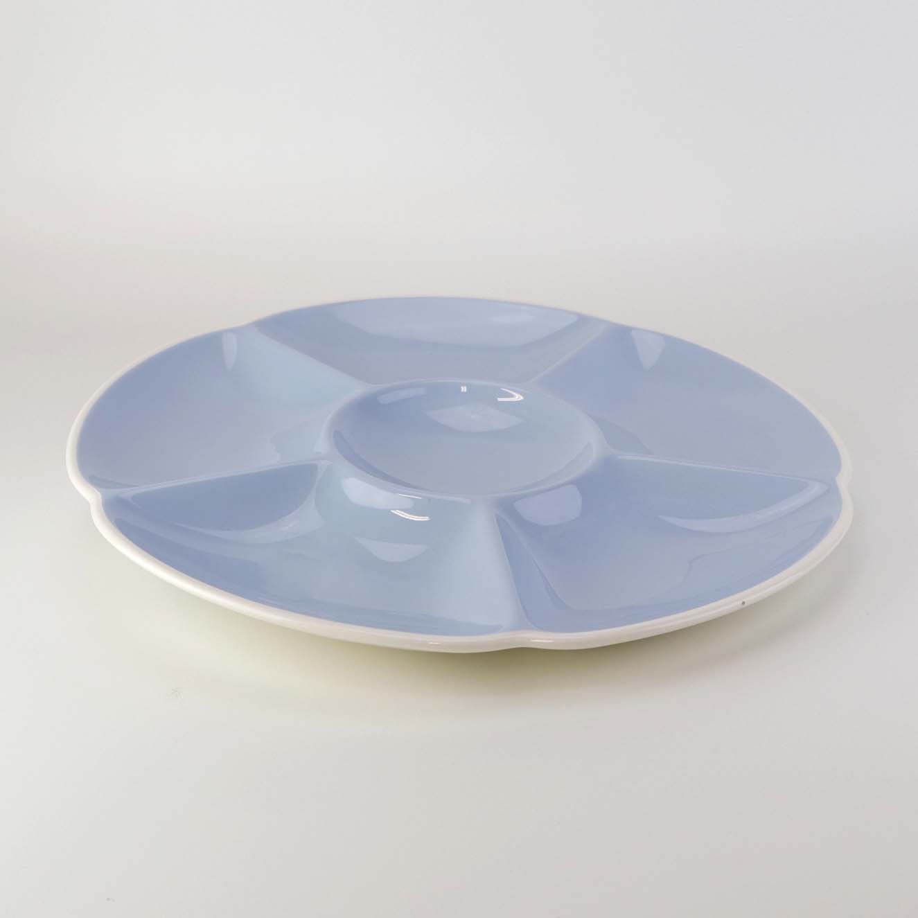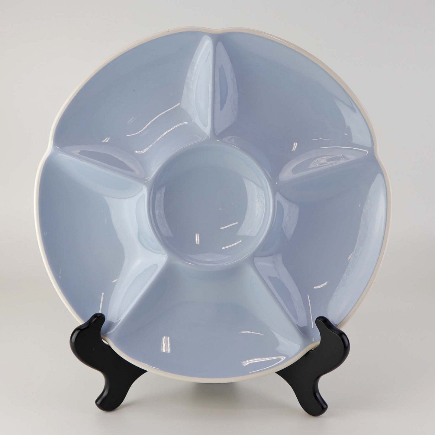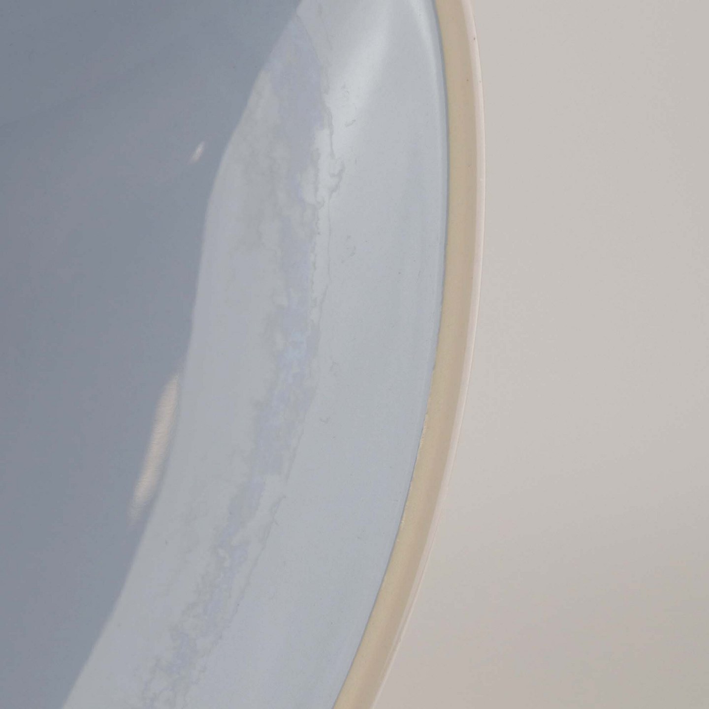 Service i lyseblå fajance dekoreret med tynd hvid kant.