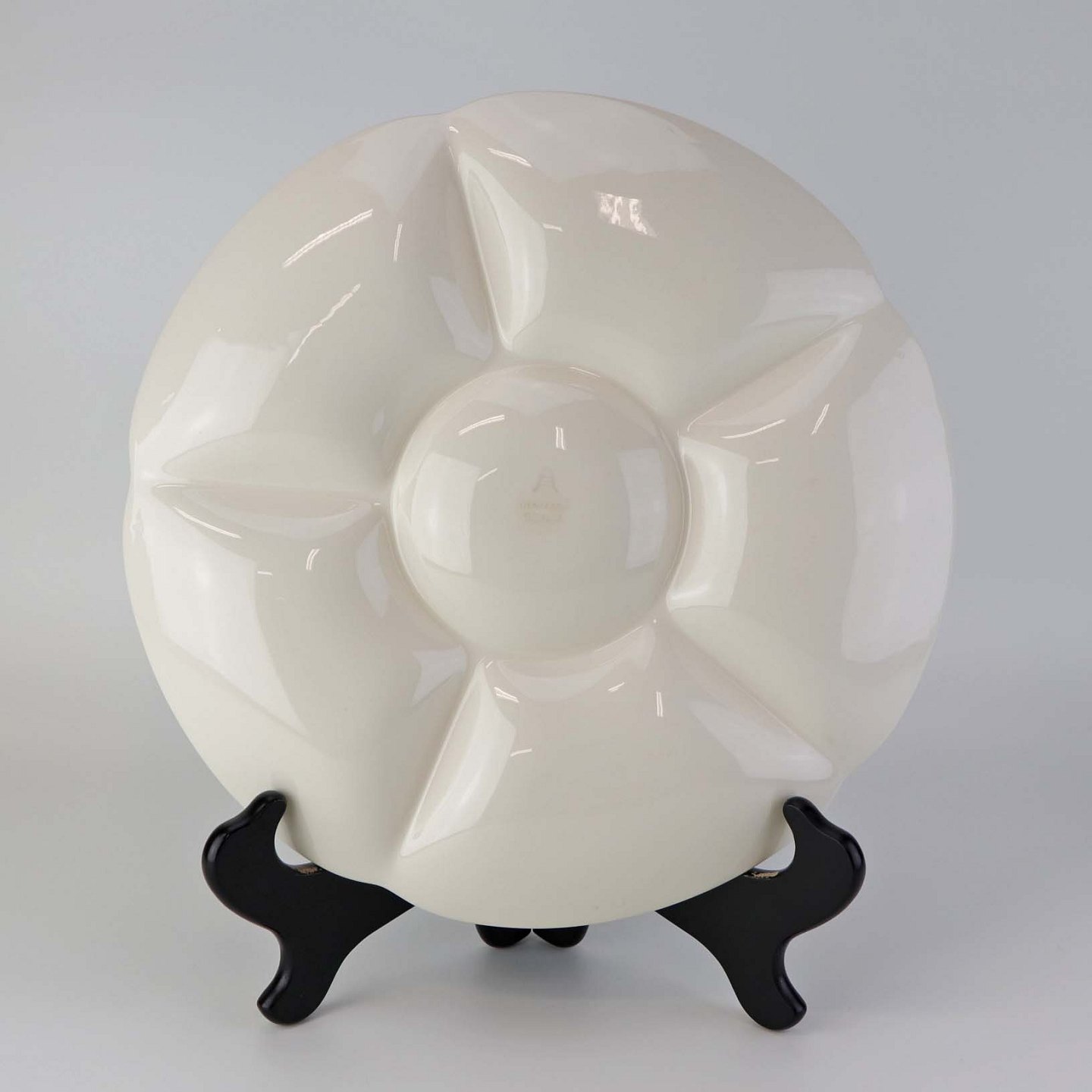 Fremstår med vandmærker på glasuren samt et enkelt minimalt nøk på kanten af fadet.