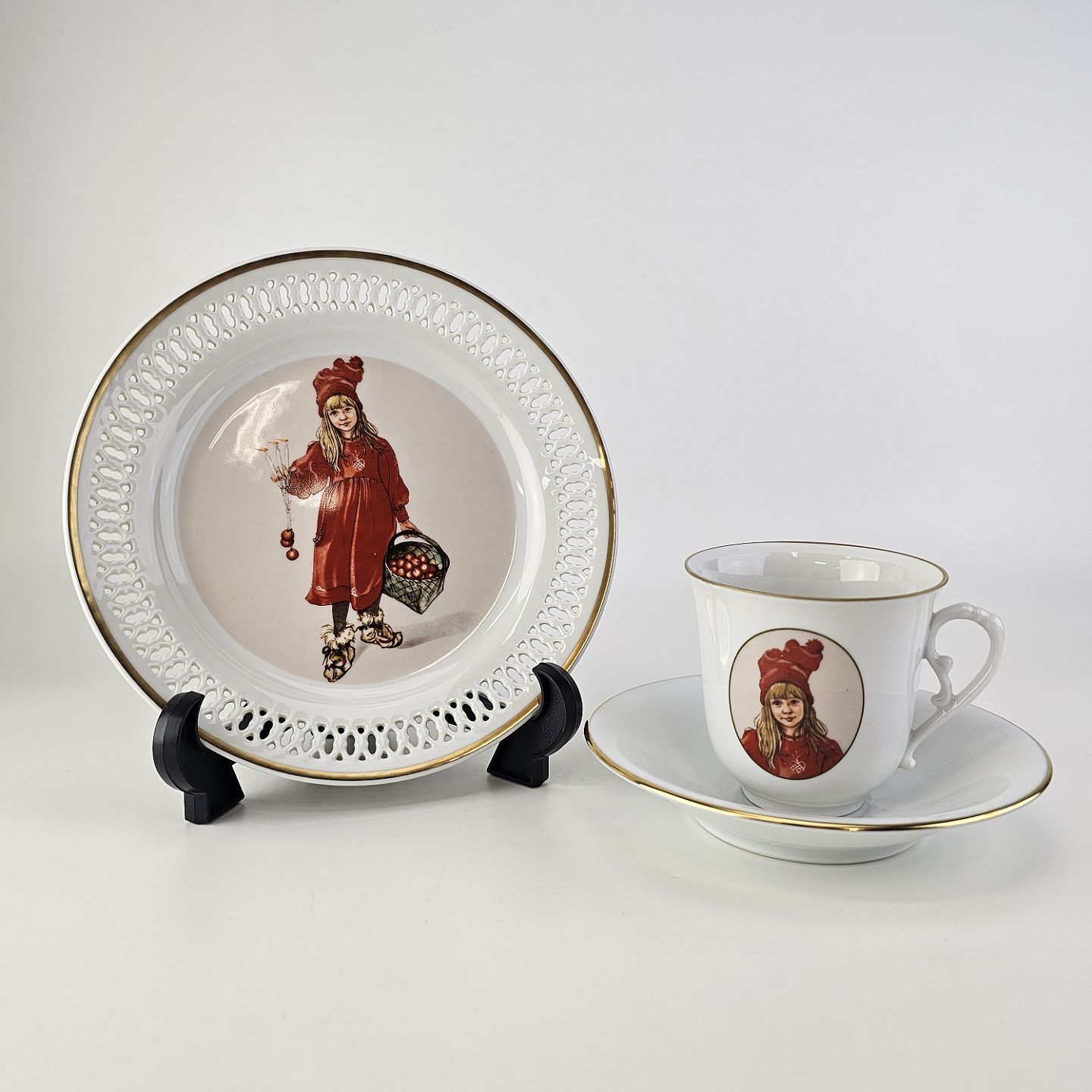 Kop med underkop i porcelæn med guldkant og platte i porcelæn med guldkant og udsnit af Carl Larsson malt 1900, fra Carl Larsson kaffestellet.