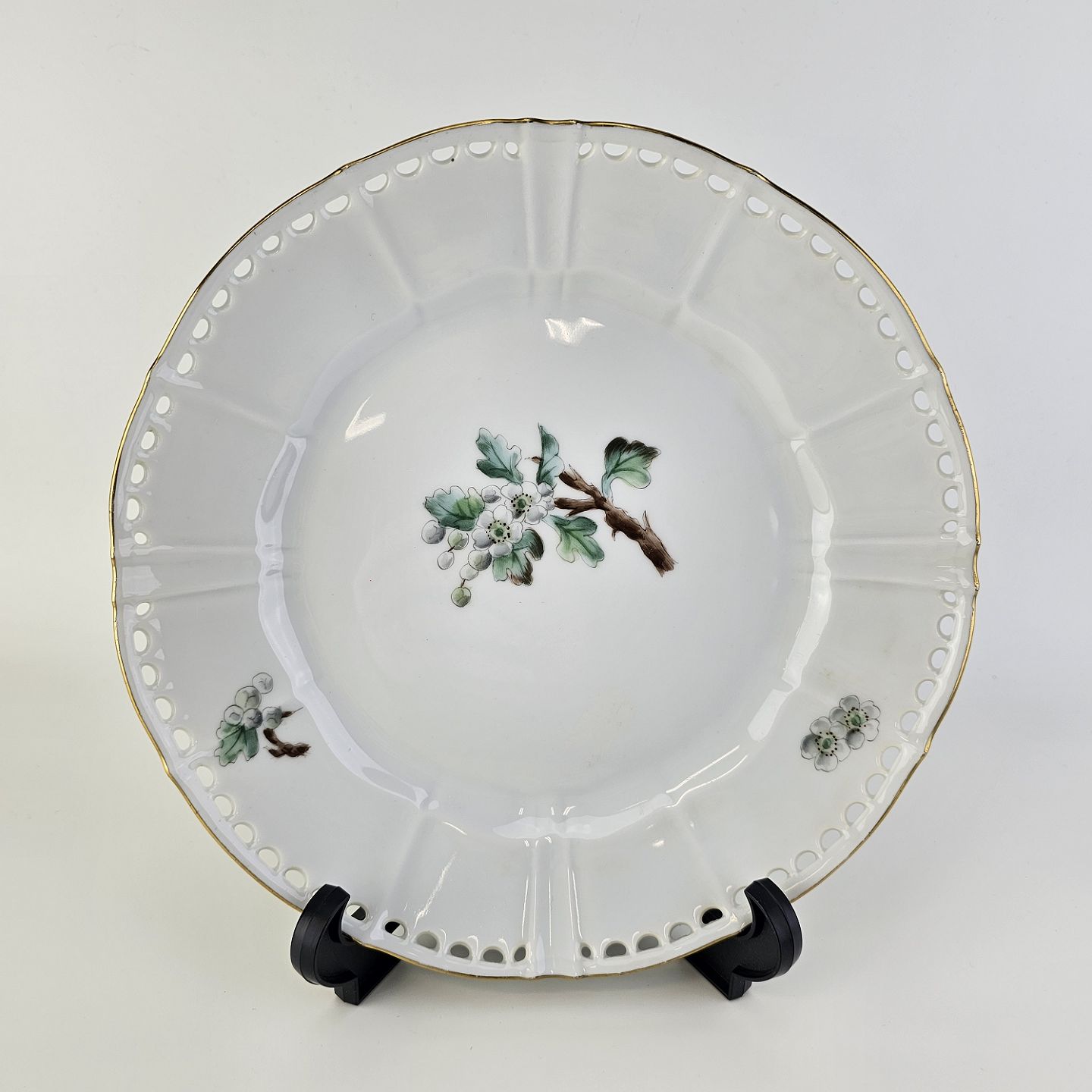 Eremitage er porcelæn dekoreret med hvidtjørn og guldkant, frokosttallerkenen har gennembrudt kant