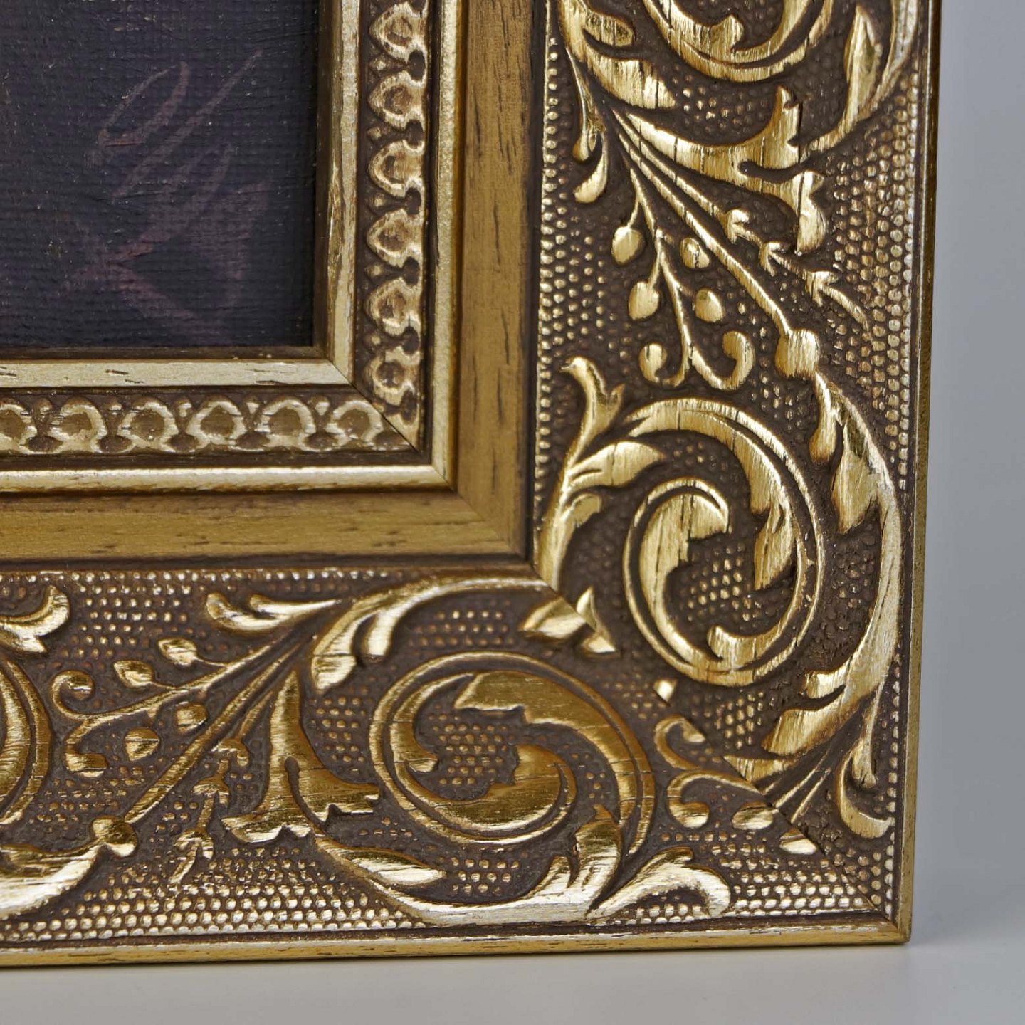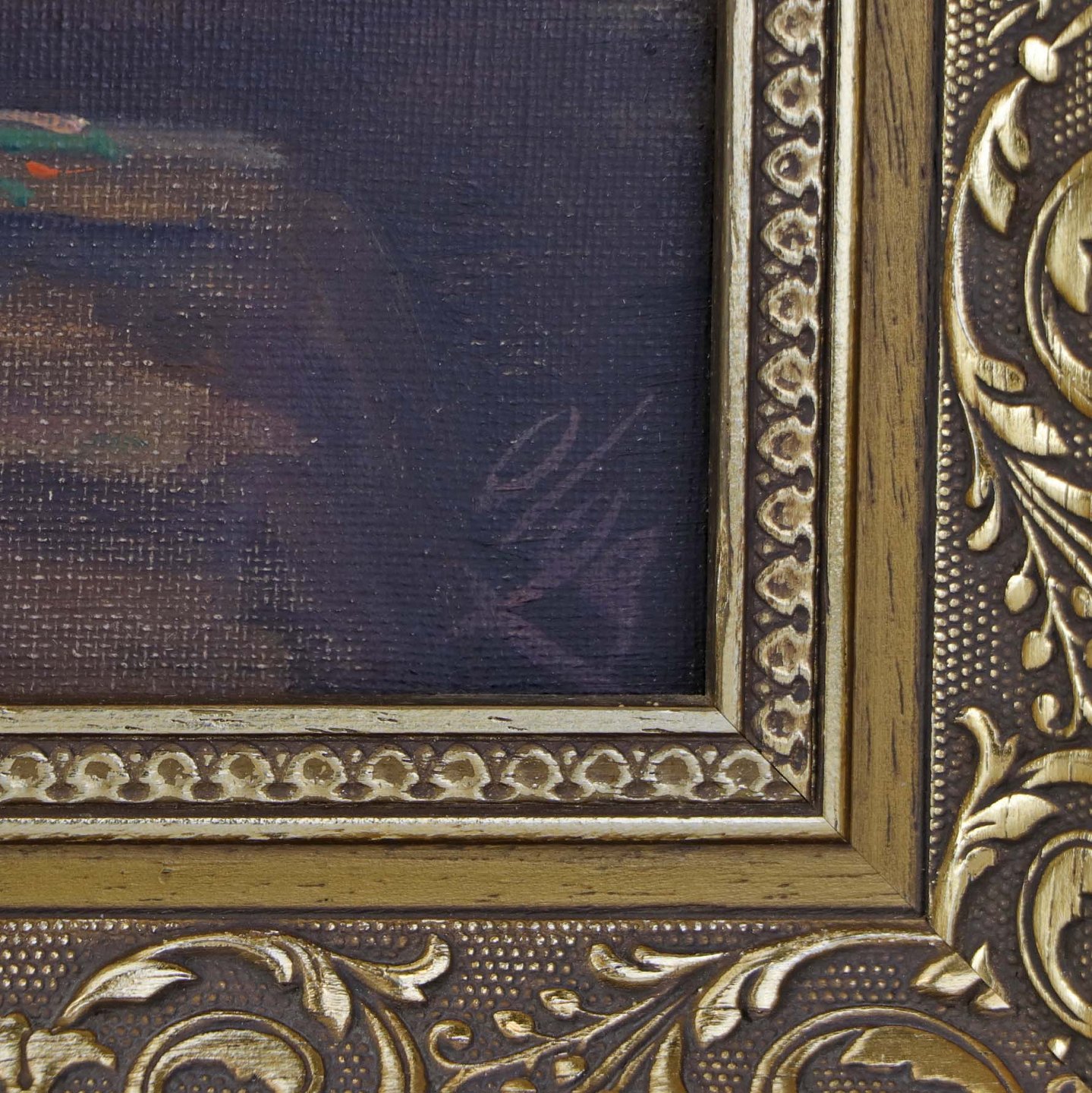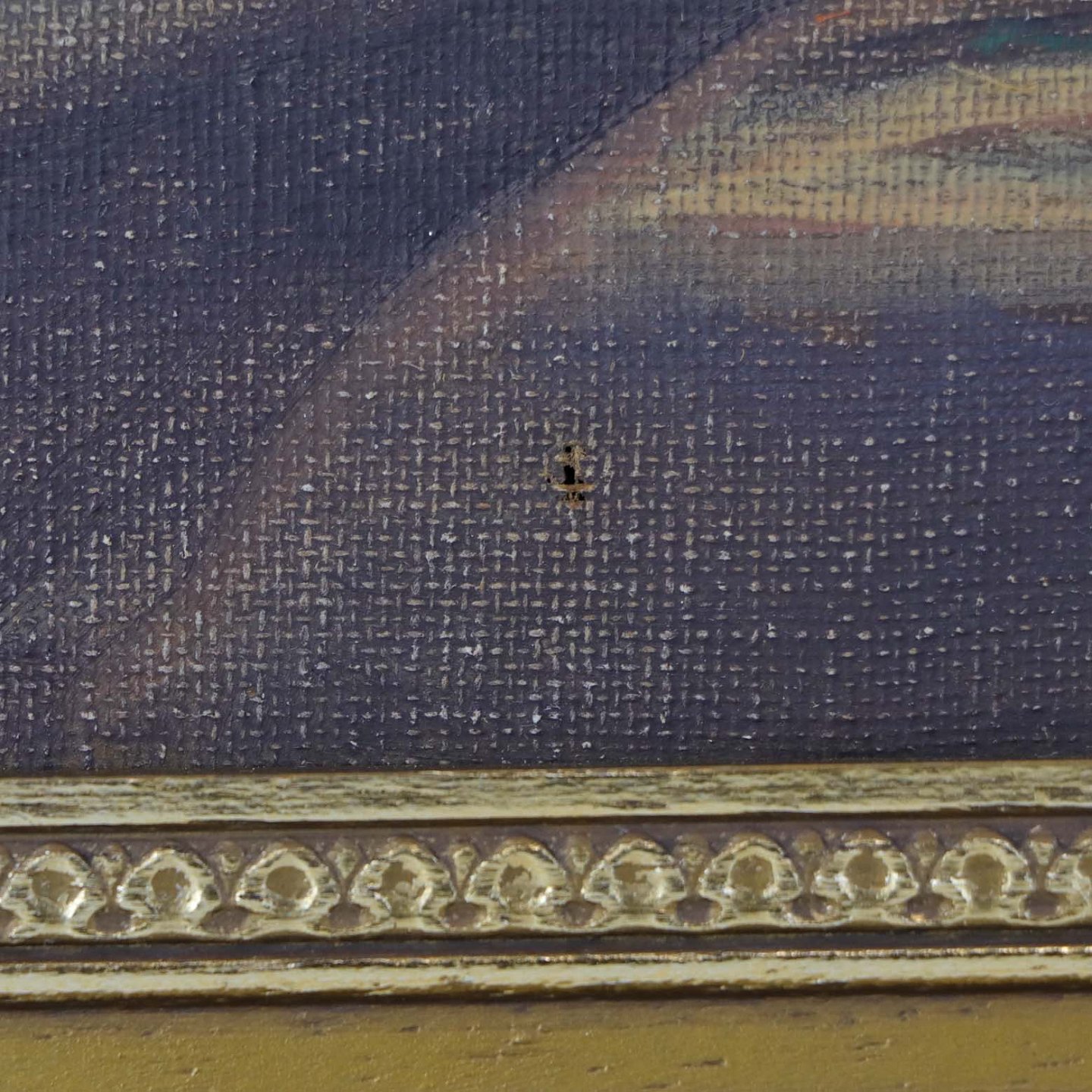 Fremstår med to minimale huller i lærredet samt mindre brugsspor på rammen.