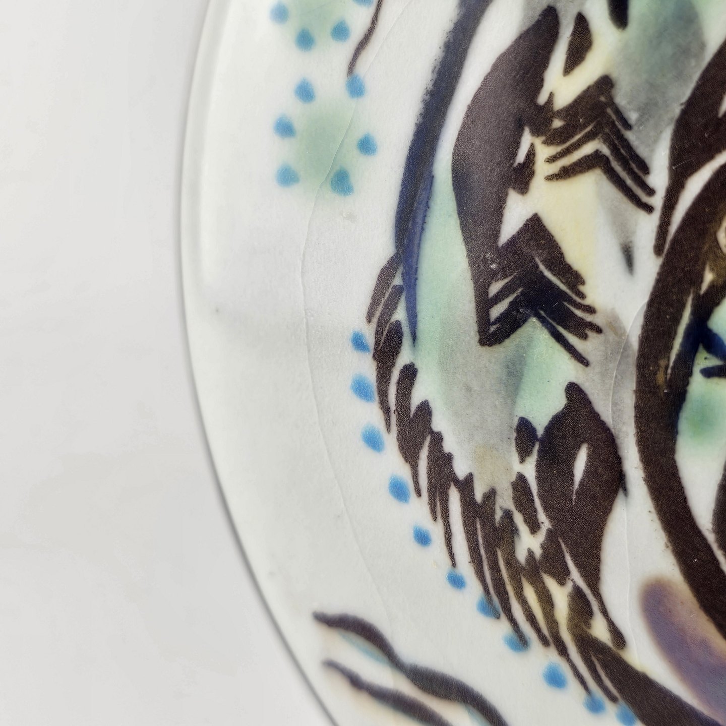 Fremstår med en misfarvning ved kanten, diverse små nister i overfladen, og en krakelering
