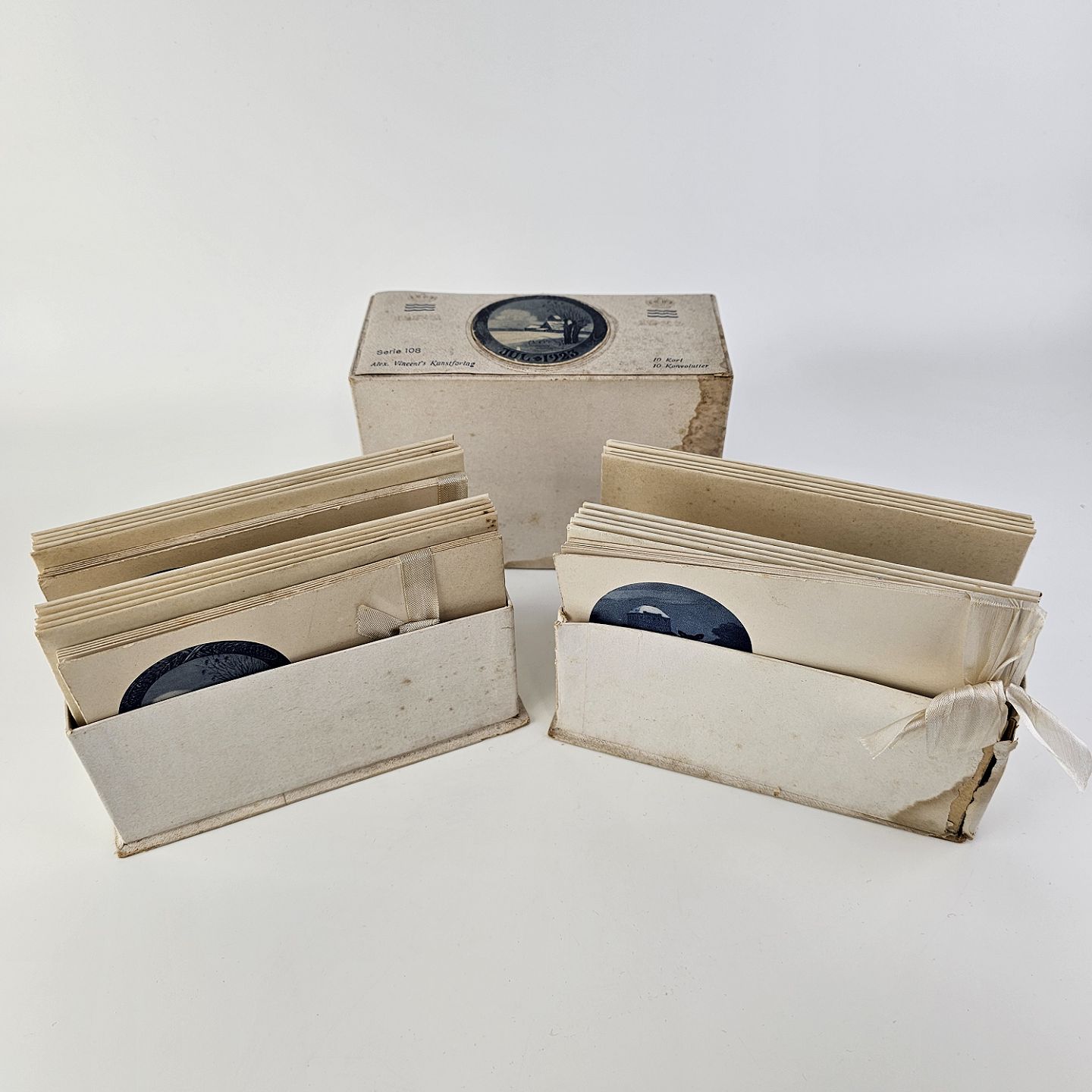 Brevkort med motiv af juleplatte fra 1923 fra Bing & Grøndahl og Royal Copenhagen. 10 kort og 10 kuverter