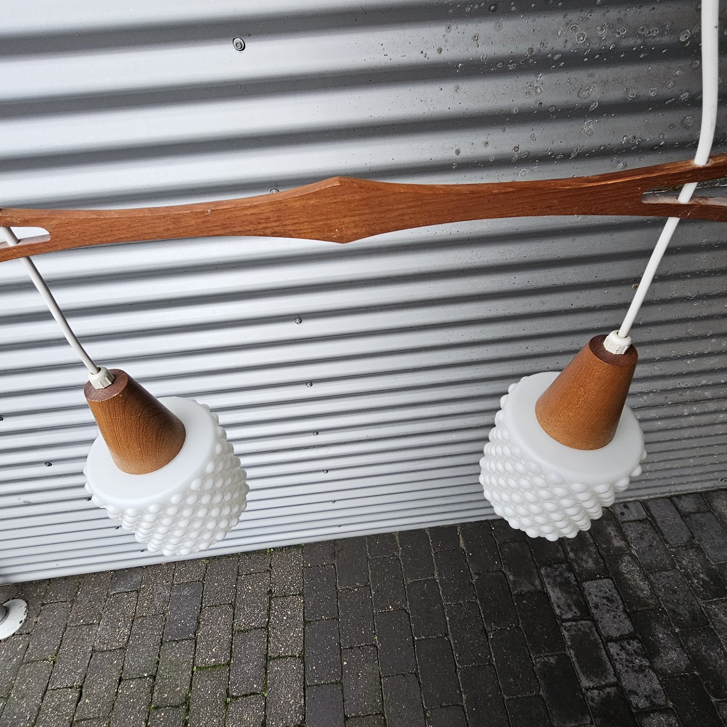 Pendel med ophæng i teak træ og skærme af hvidt opalglas