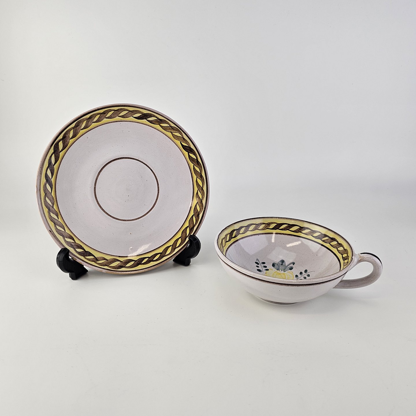 Kop og underkop i keramik med gule detaljer og blomsterdekoration