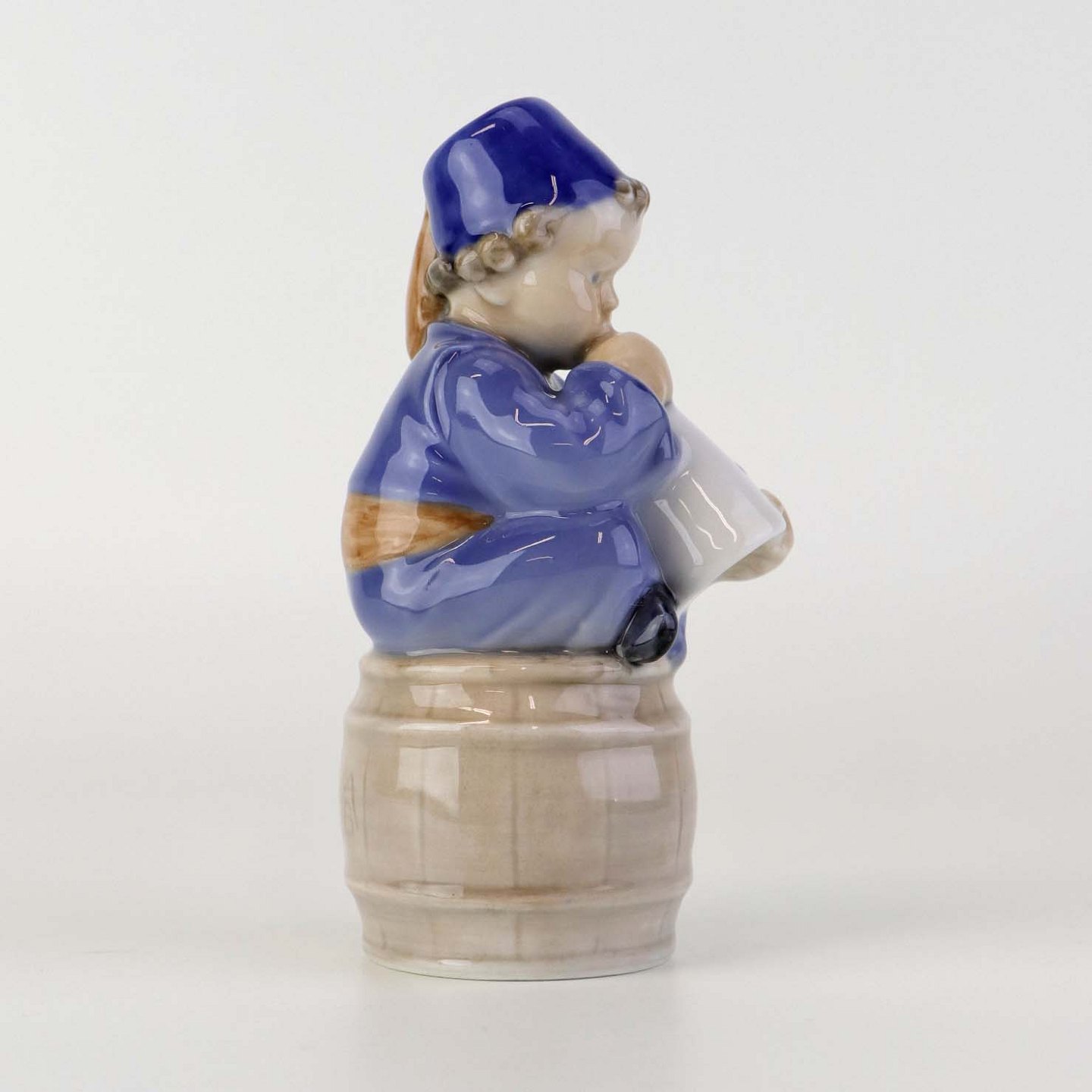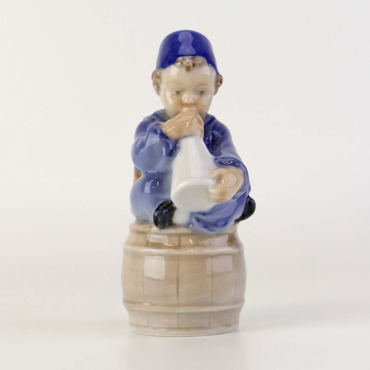 Figur i porcelæn med motiv af siddende dreng på tønde blæsende på et horn. Nr. 3689