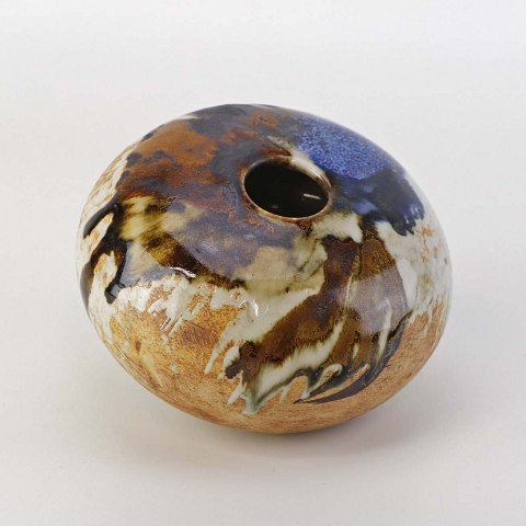 Lav rund vase i keramik. Delvist glaseret med flerfarvet mat og glansfuld glasur.