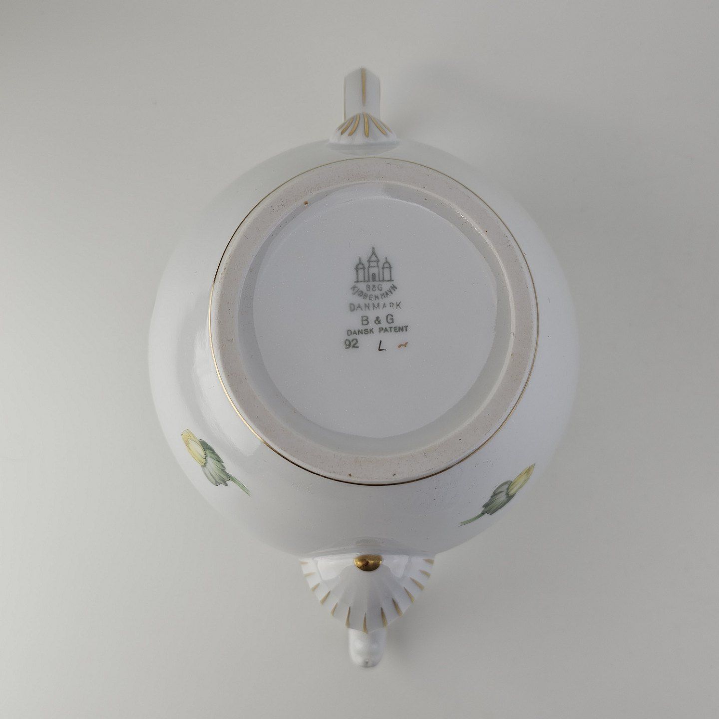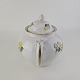 Hvidt porcelæn i skælform med dekoration af gule blomster og guldkant