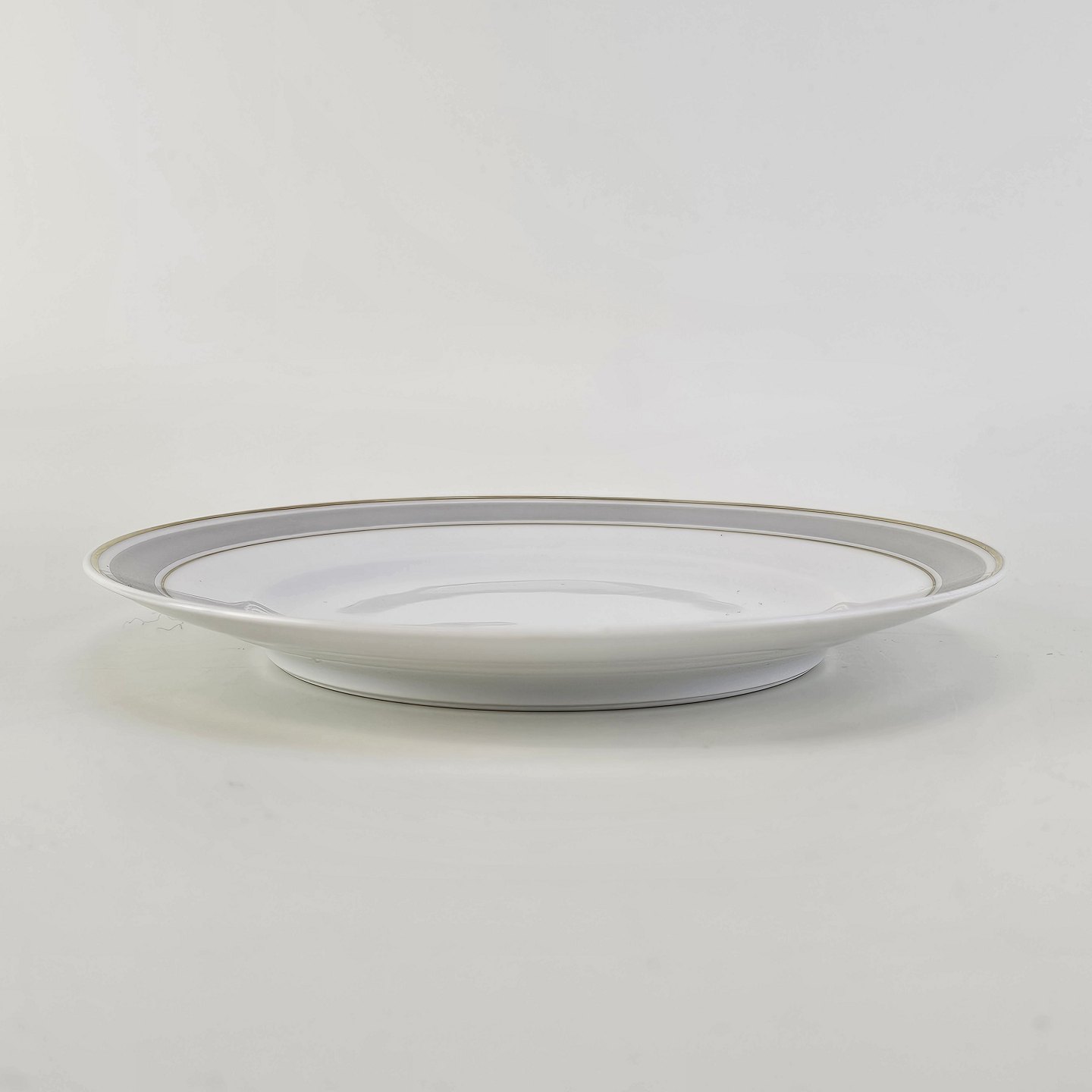 Tiber er stel i glat hvidt porcelæn med grå bort og guldkant