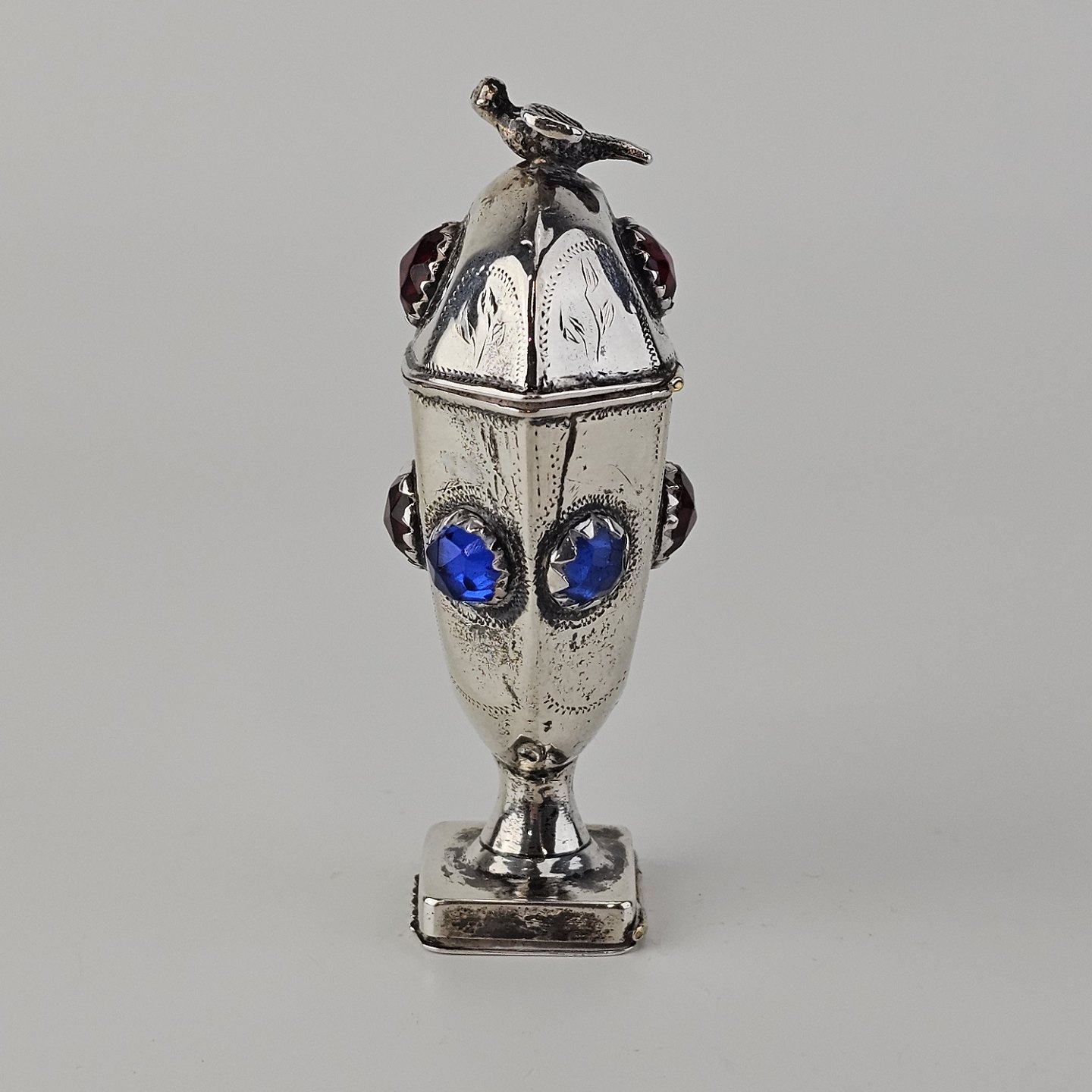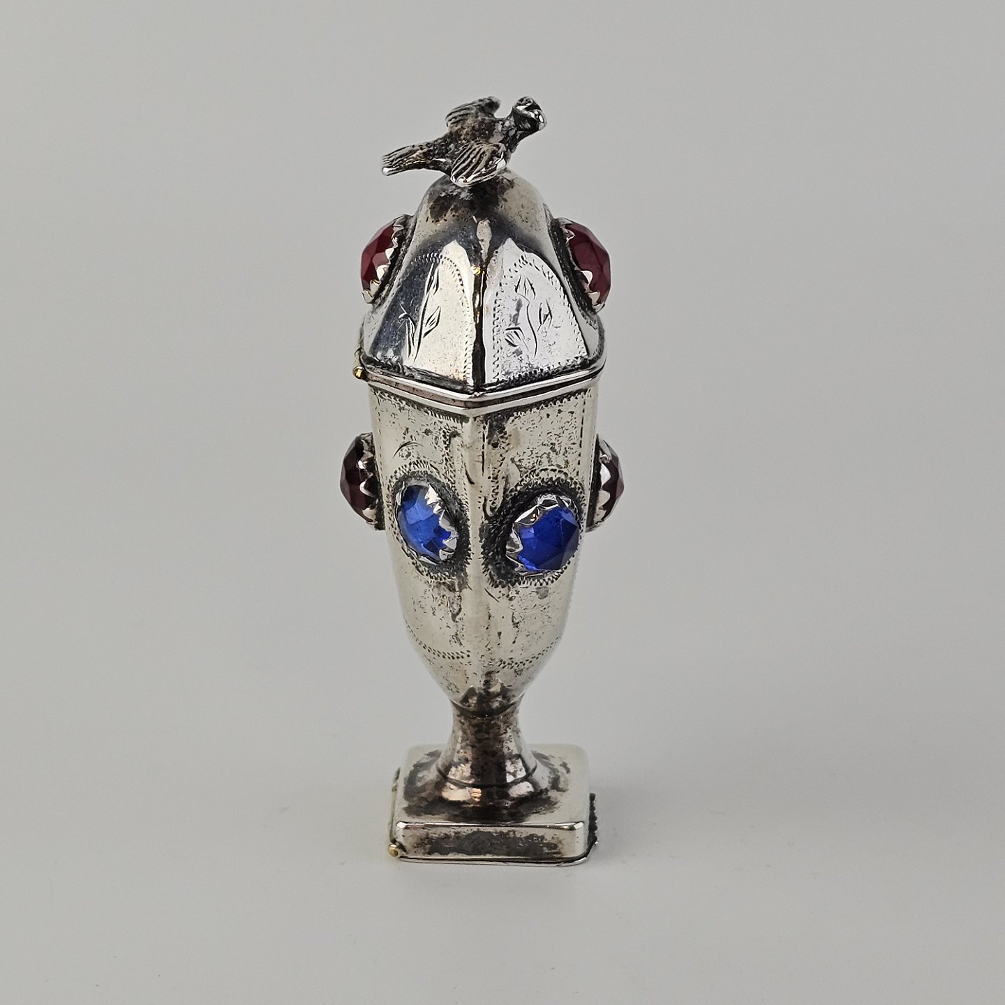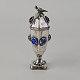 Hovedvandsæg i sølv dekoreret med forskellige smykkesten og en fugl på toppen