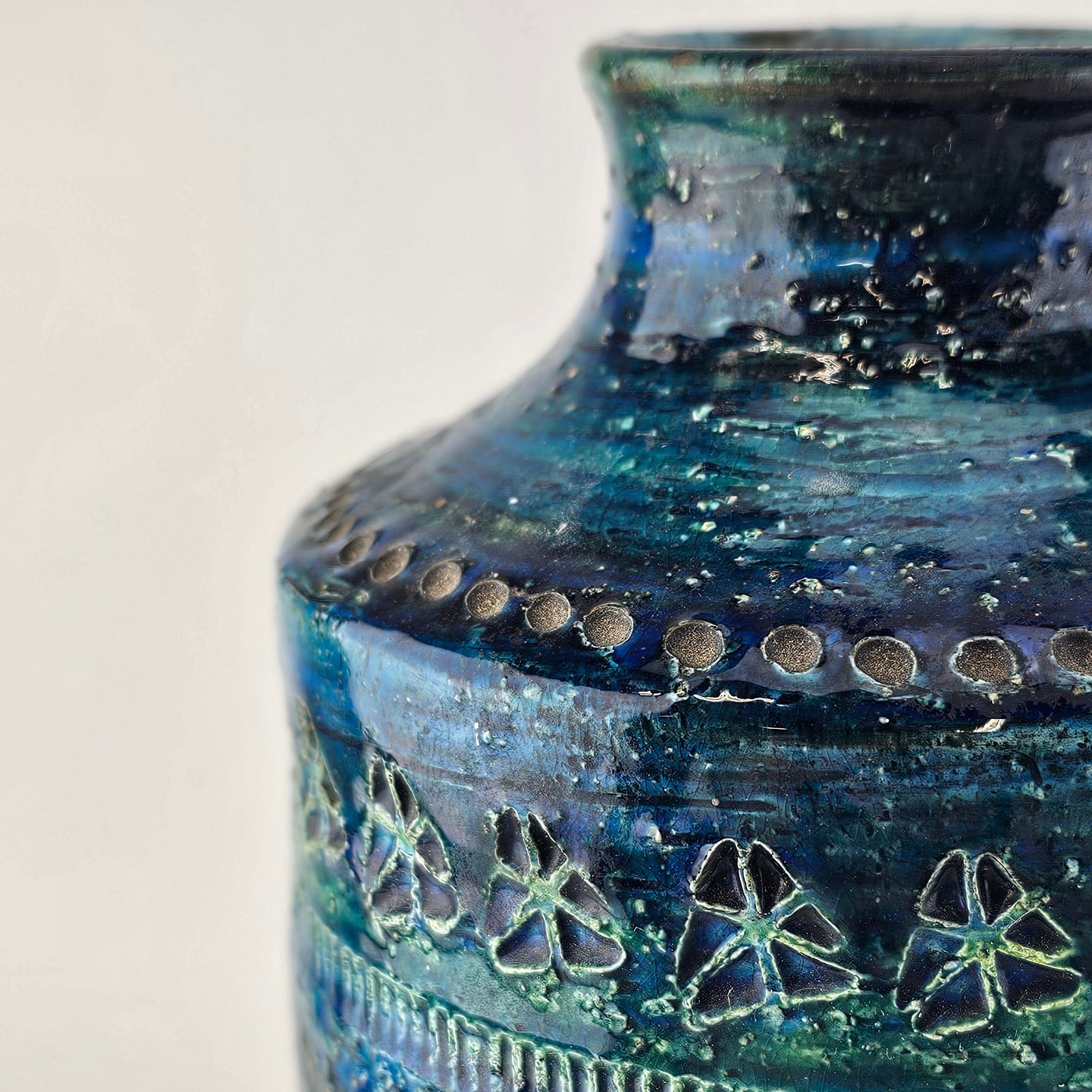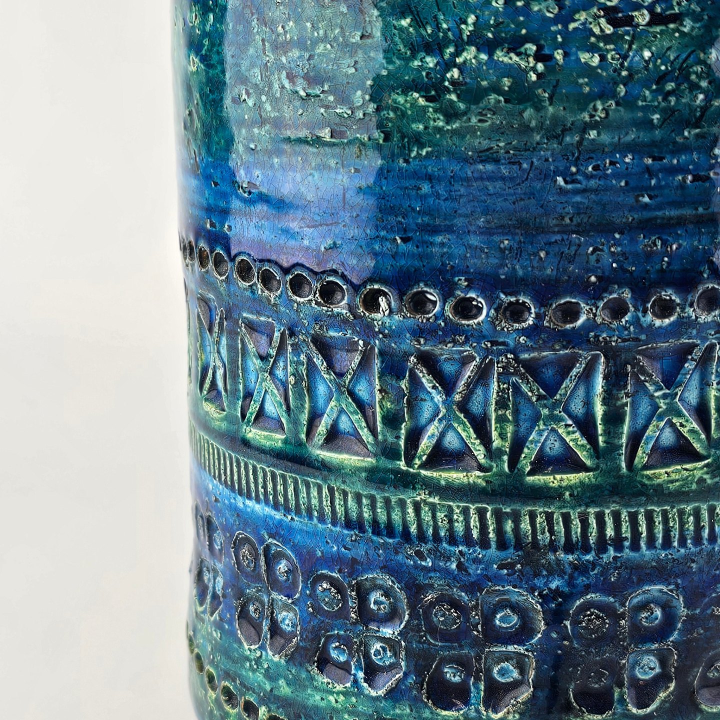 Vase af keramik med rimini blå glasering og geometriske mønstre
