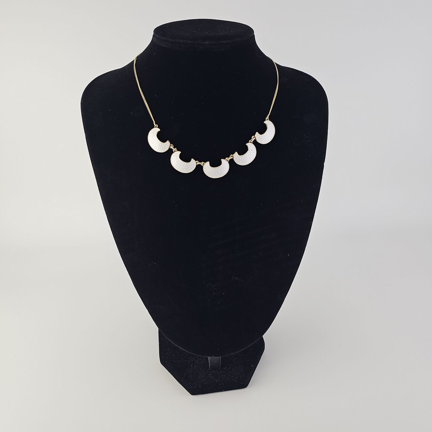 Halskæde i forgyldt sterling sølv med halvmåneformede vedhæng dekoreret med hvid emalje