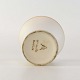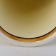 Glat fajancestel med dekoration i brune og gule farver på lys bagggrund med mørkebrun streg.