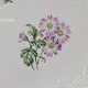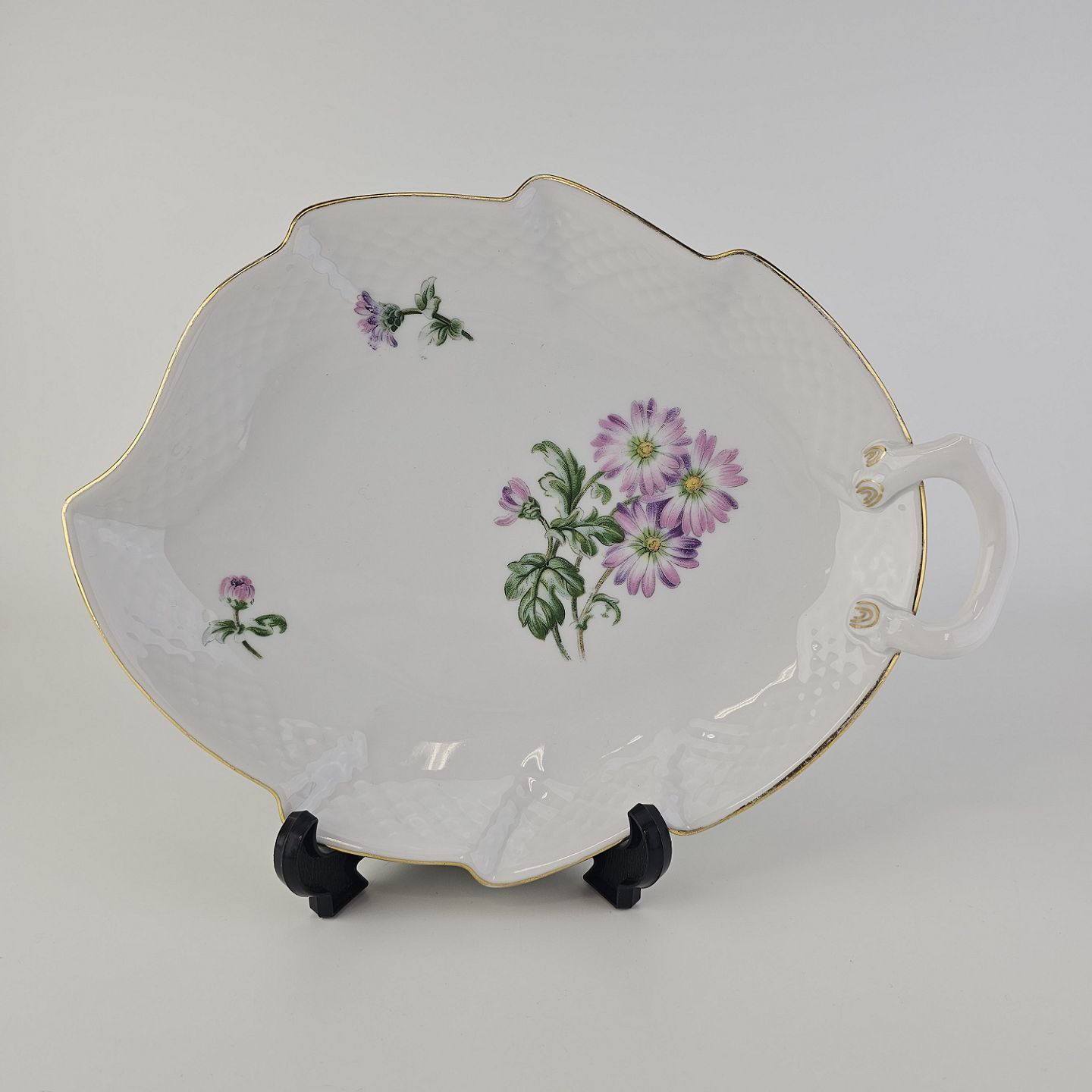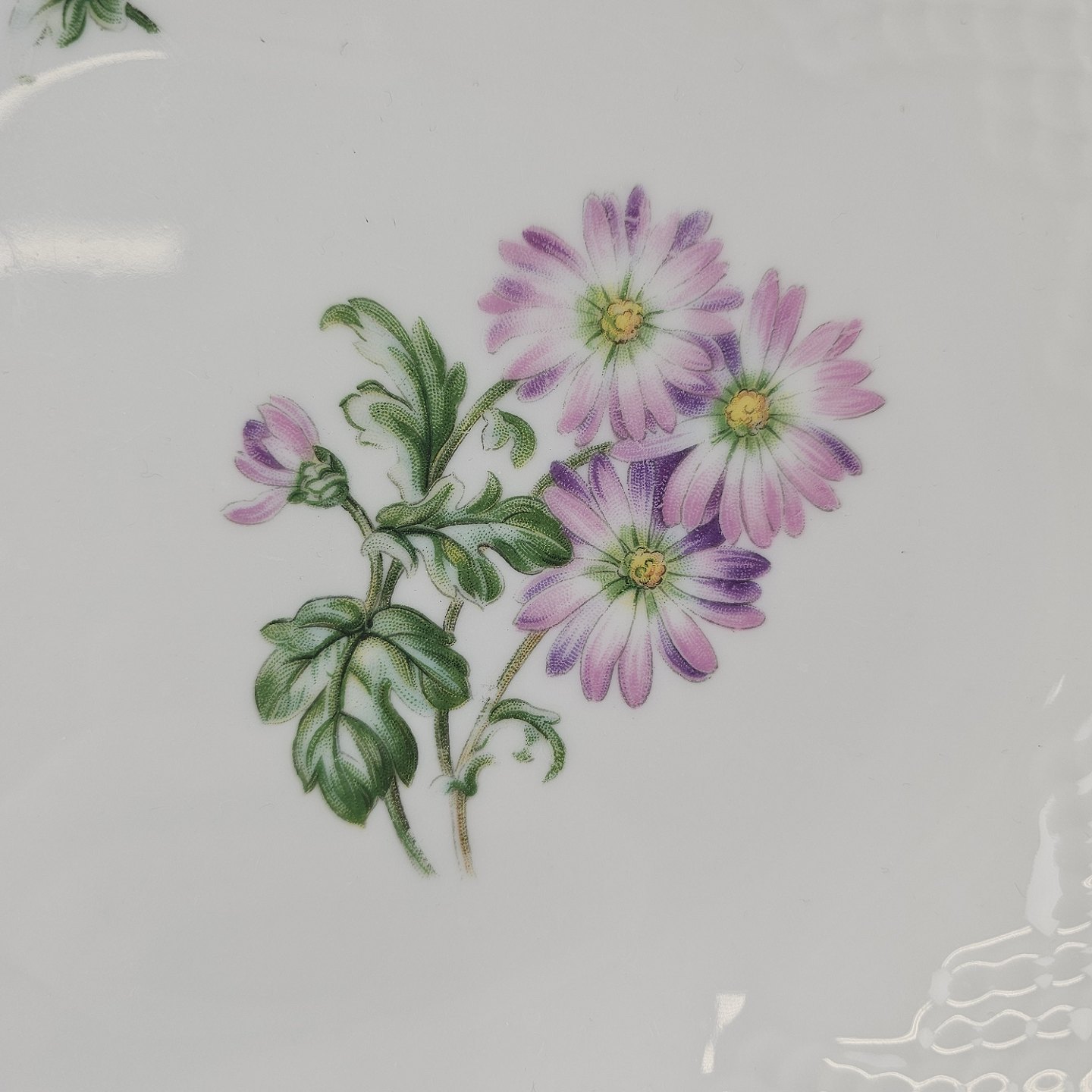 Krysantemum er hvidt porcelæn dekoreret med lys lilla blomst, grønne blade og guldkant.
