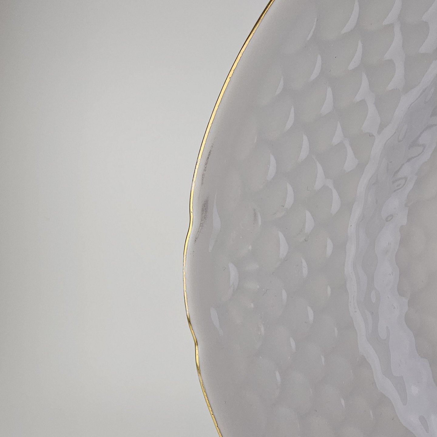 Krysantemum er hvidt porcelæn dekoreret med lys lilla blomst, grønne blade og guldkant.