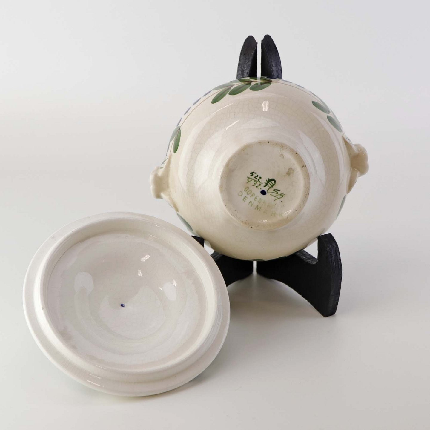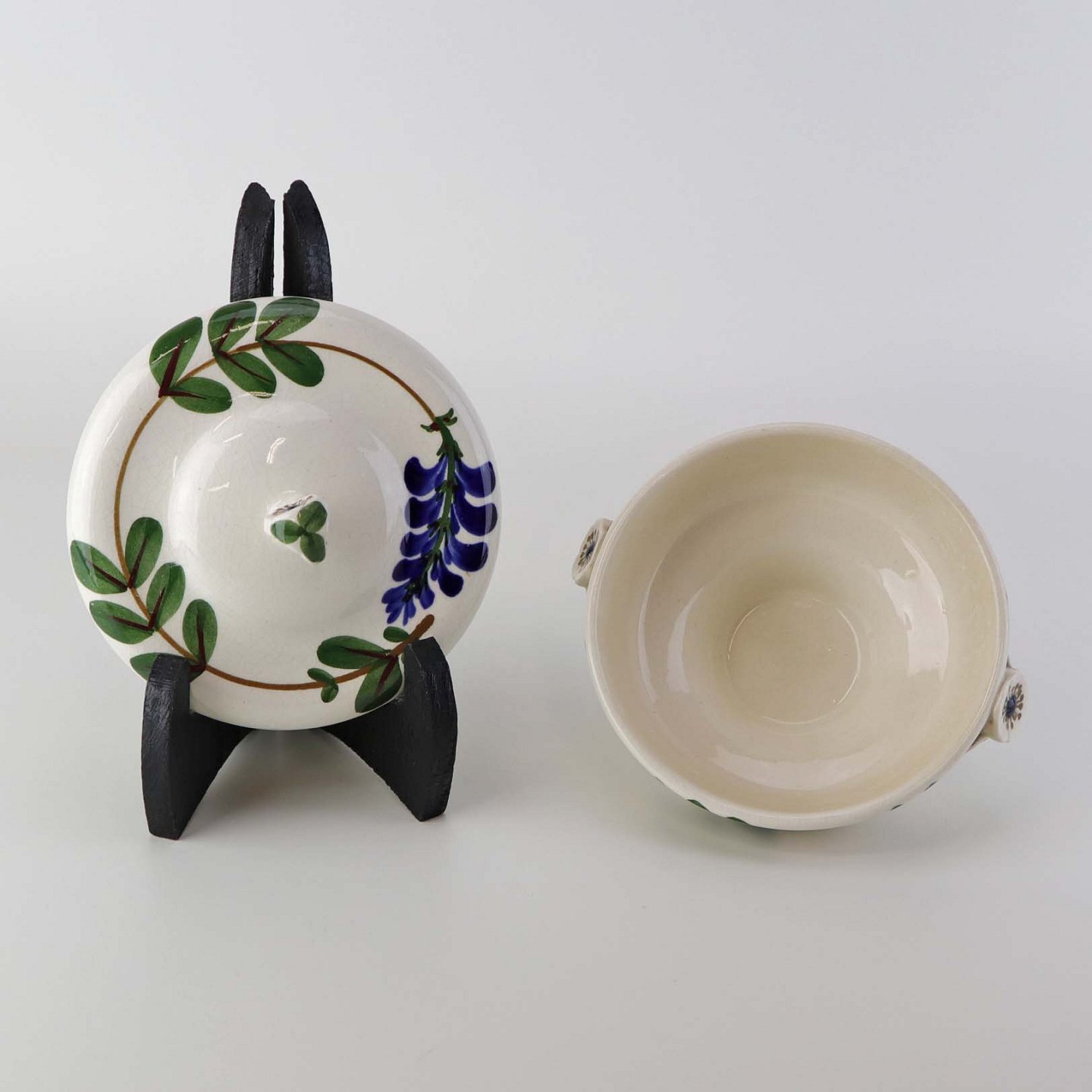 Lågkrukke til sukker i fajance fra stellet Blåregn. Stellet er fremstillet i perioden år 1903-1933. Nr. 522/432