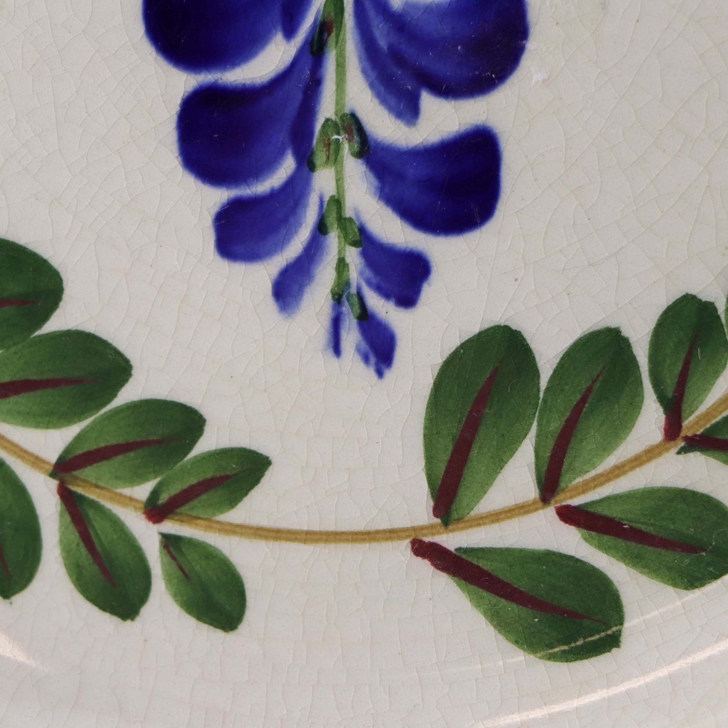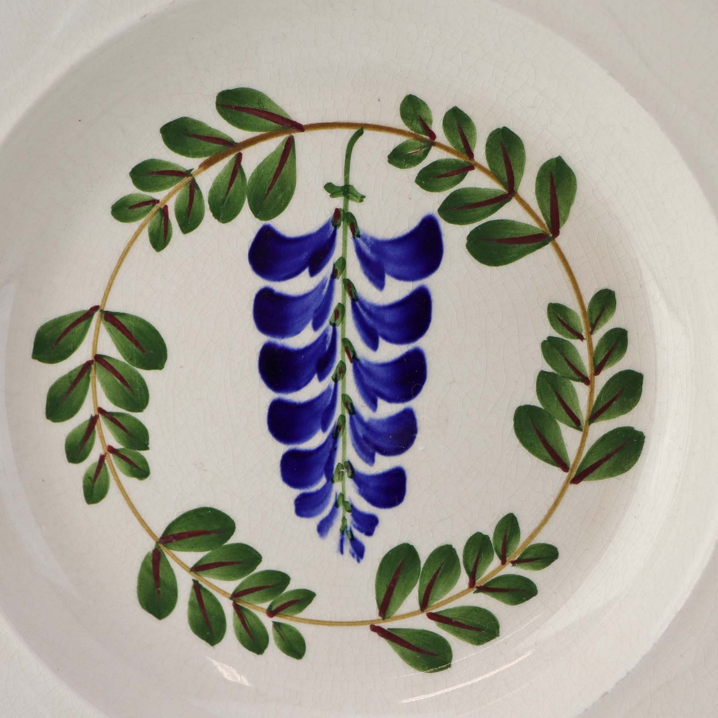 Fajancestel med dekoration af ranker af blåregn og blade på lys baggrund afsluttet med kant af runde blå pletter.
