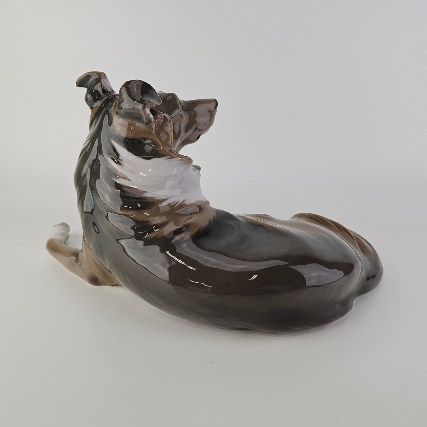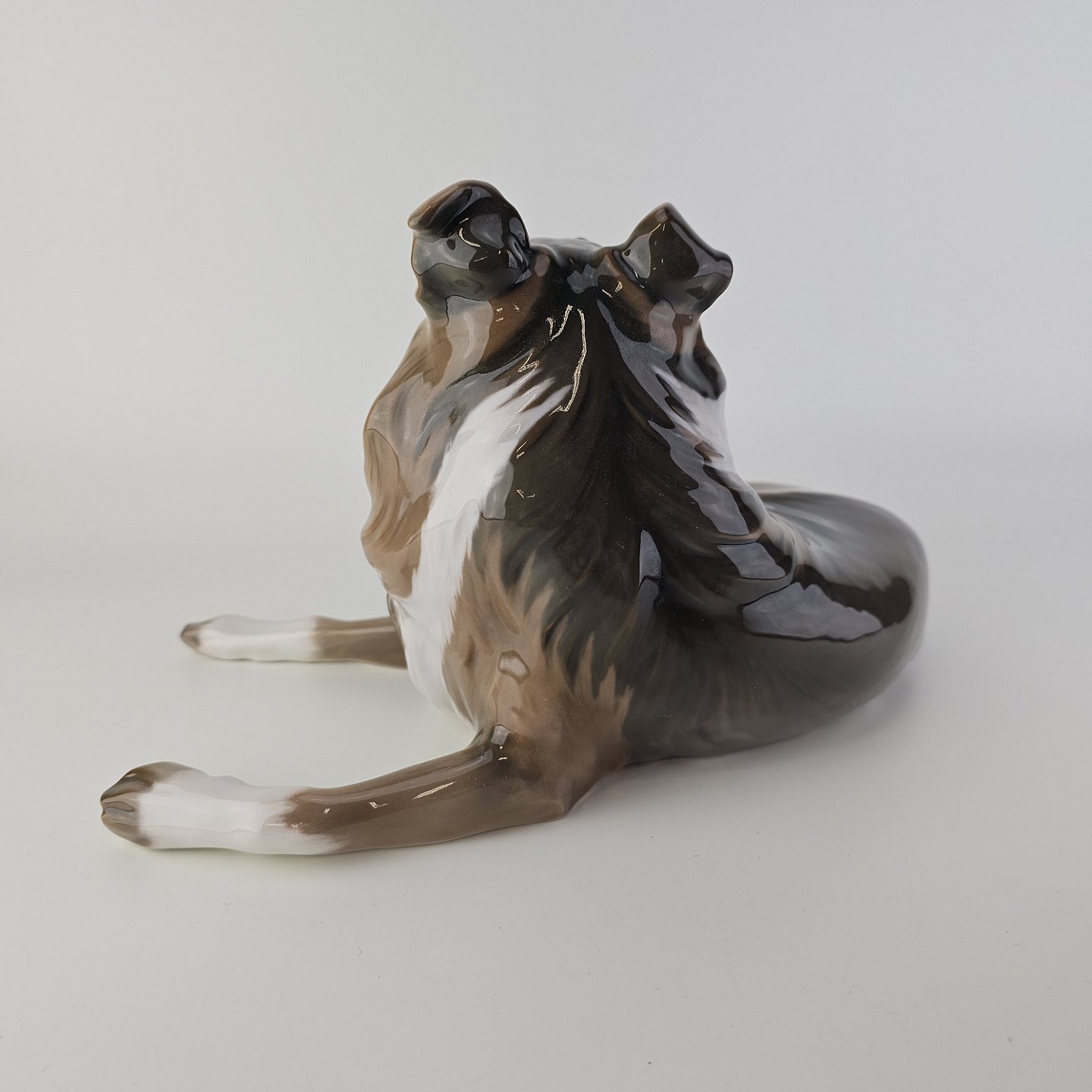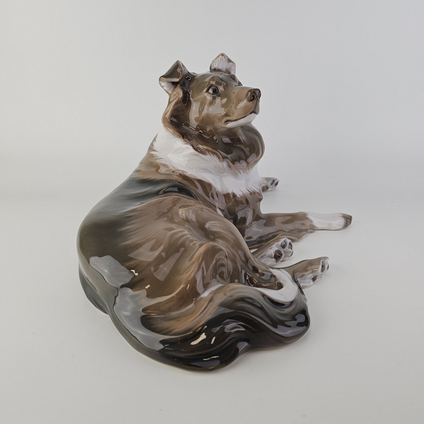 Figur i hvidt porcelæn med motiv af en liggende hund.