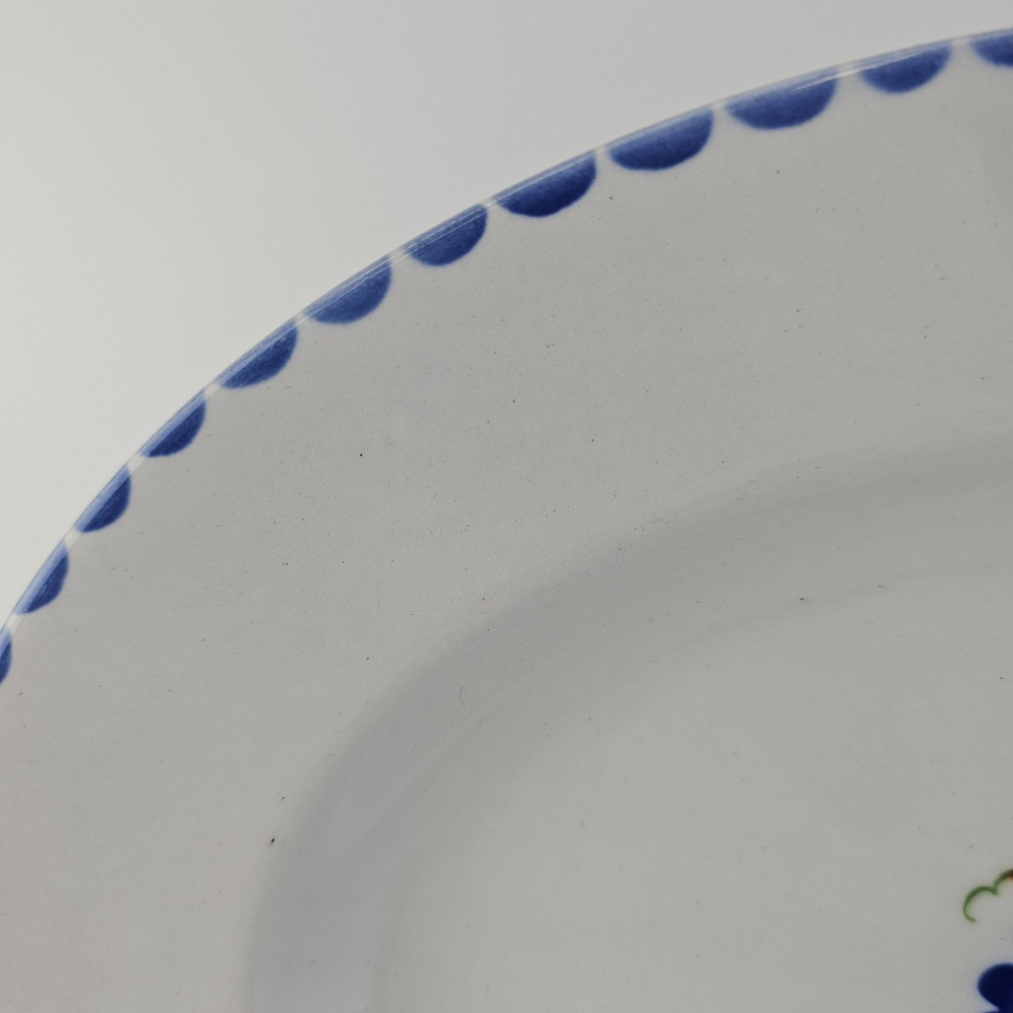 Hvidt fajancestel i stelform Sterling med motiv af blå blomster og blå prikker på kanten.