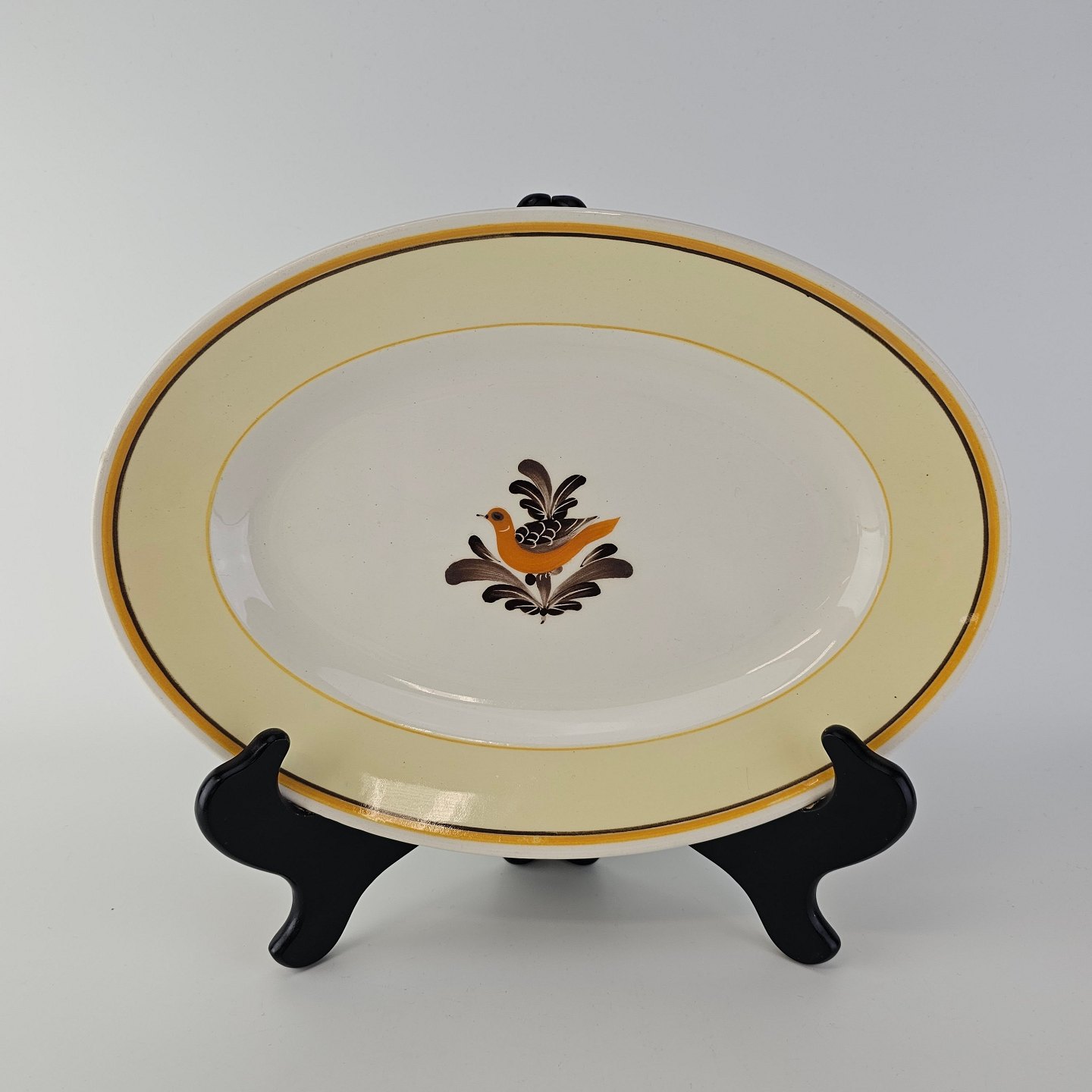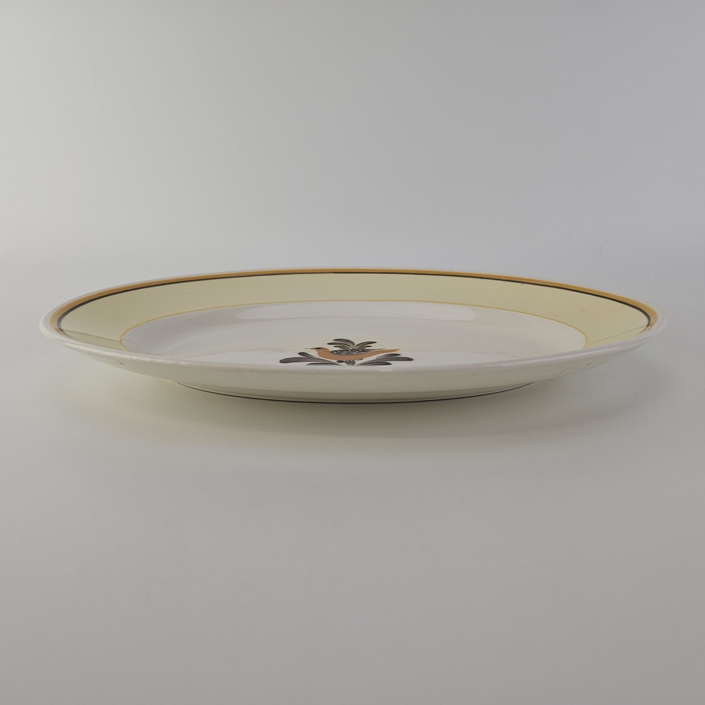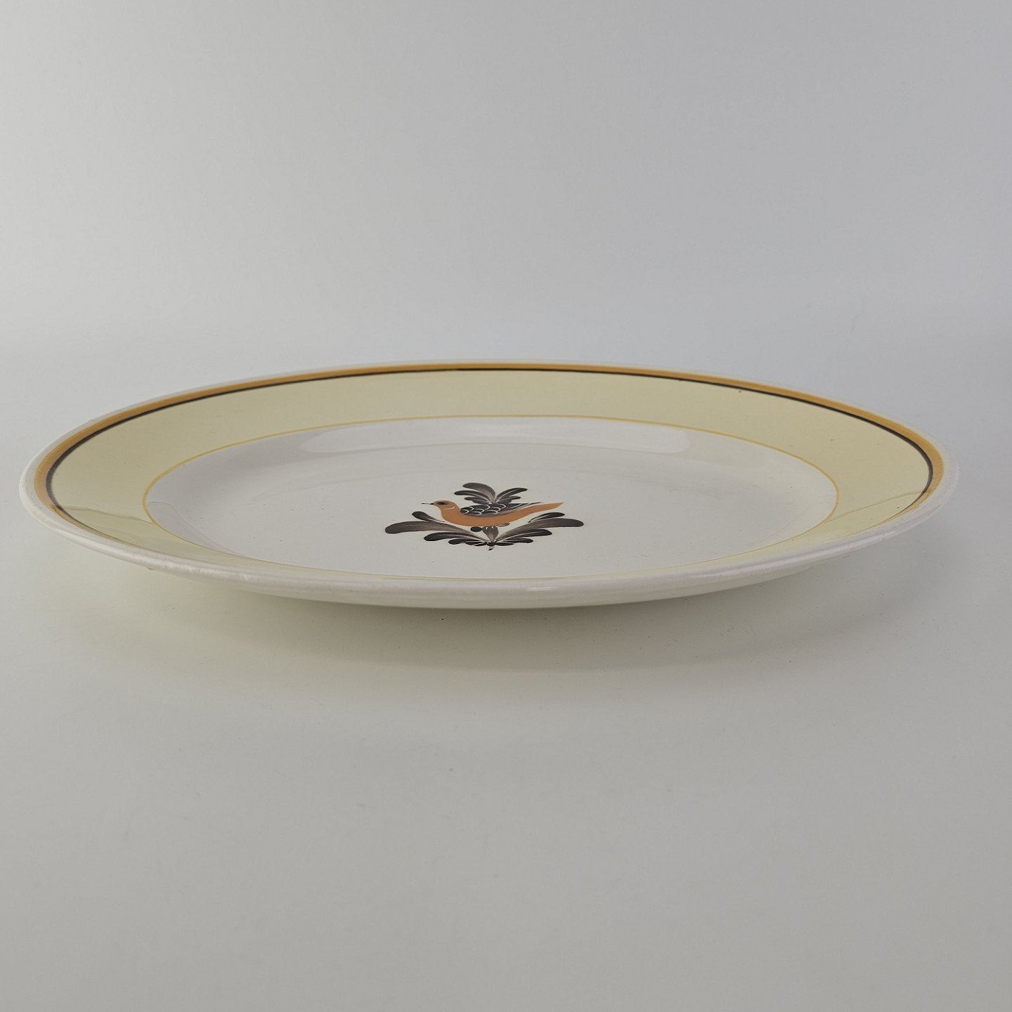 Ovalt fad i fajance fra stellet Margrethe fremstillet i perioden 1937-1940.