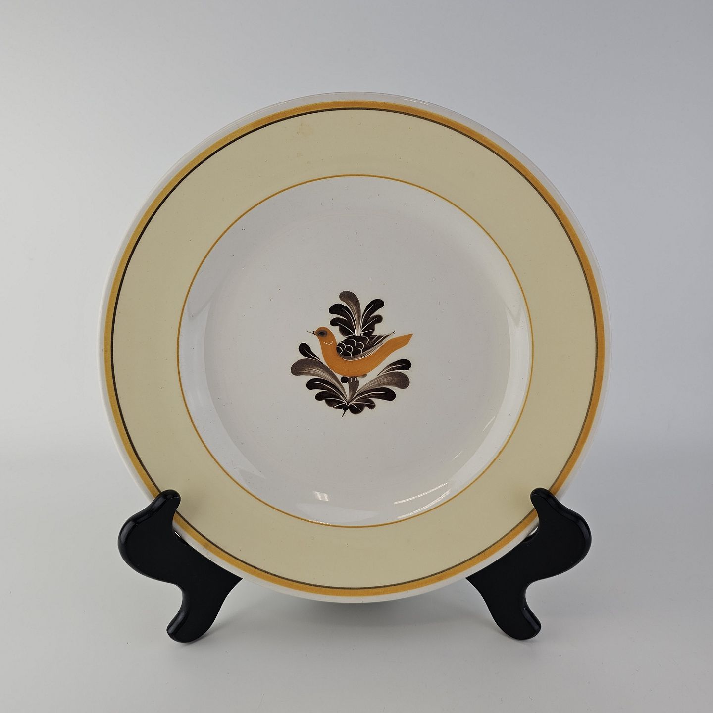 Hvidt fajancestel i stelform G med motiv af en orange og brun fugl og kant.