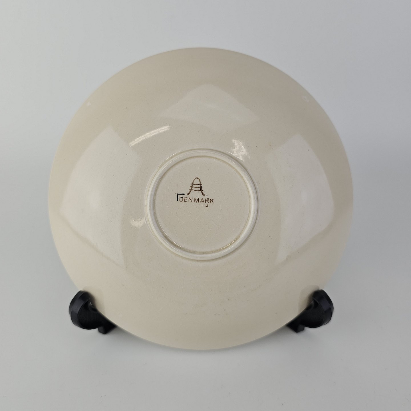 Råhvidt fajancestel i stelform E med dekoration af naturmotiver i sølv og sort farve.