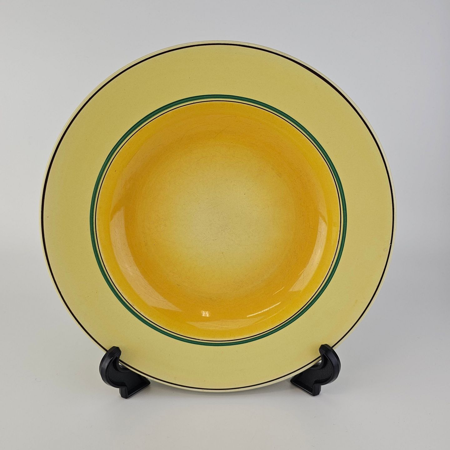 Fajancestel i stelform C med dekoration i gule nuancer med grøn stribe.